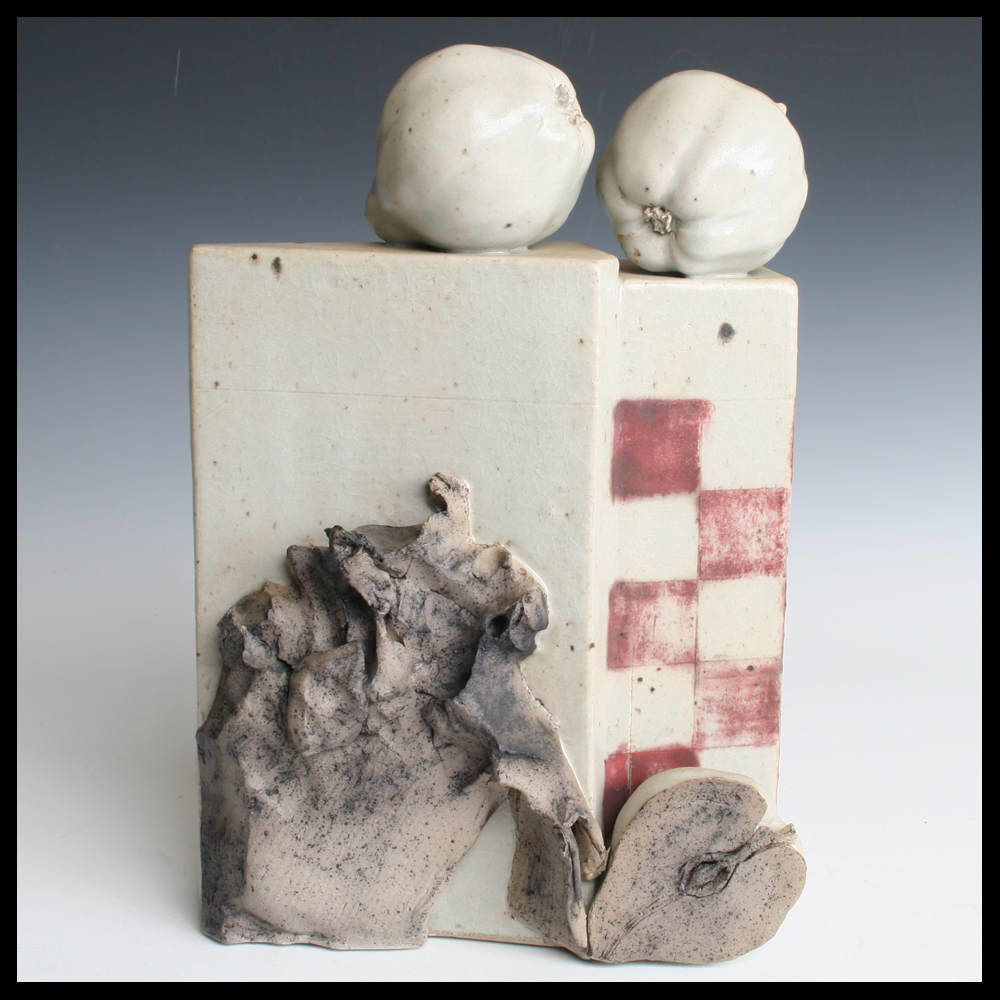 Antje Brüggemann-Breckwoldt (DE), keramisch plastiek van een stillevenzuil met een geometrisch ossenbloedrood blokkenpatroon en plastisch gevormde vruchten, hiervan zijn twee kweeperen bovenop gemonteerd met aan de onderzijde voor een halve verse peer, aan de achterzijde een halve rotte peer en afval als een vanitas symbolisering, handgevormd, steengoedklei, monochroom lichtgrijs geglazuurd, hoogte 32,8 cm, breedte 21,8 cm en diepte 11 cm, gesigneerd met monogram aan onderzijde en gedateerd (19)82.