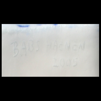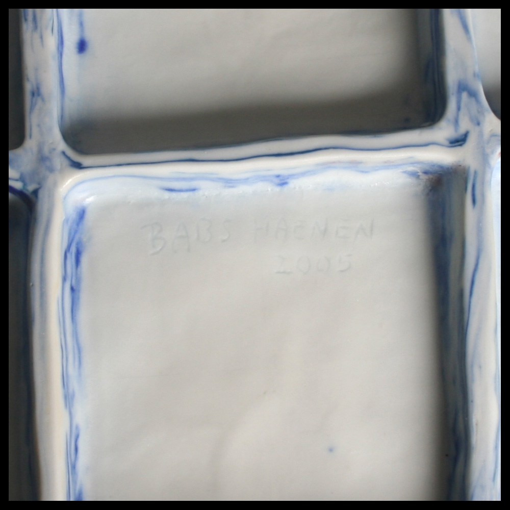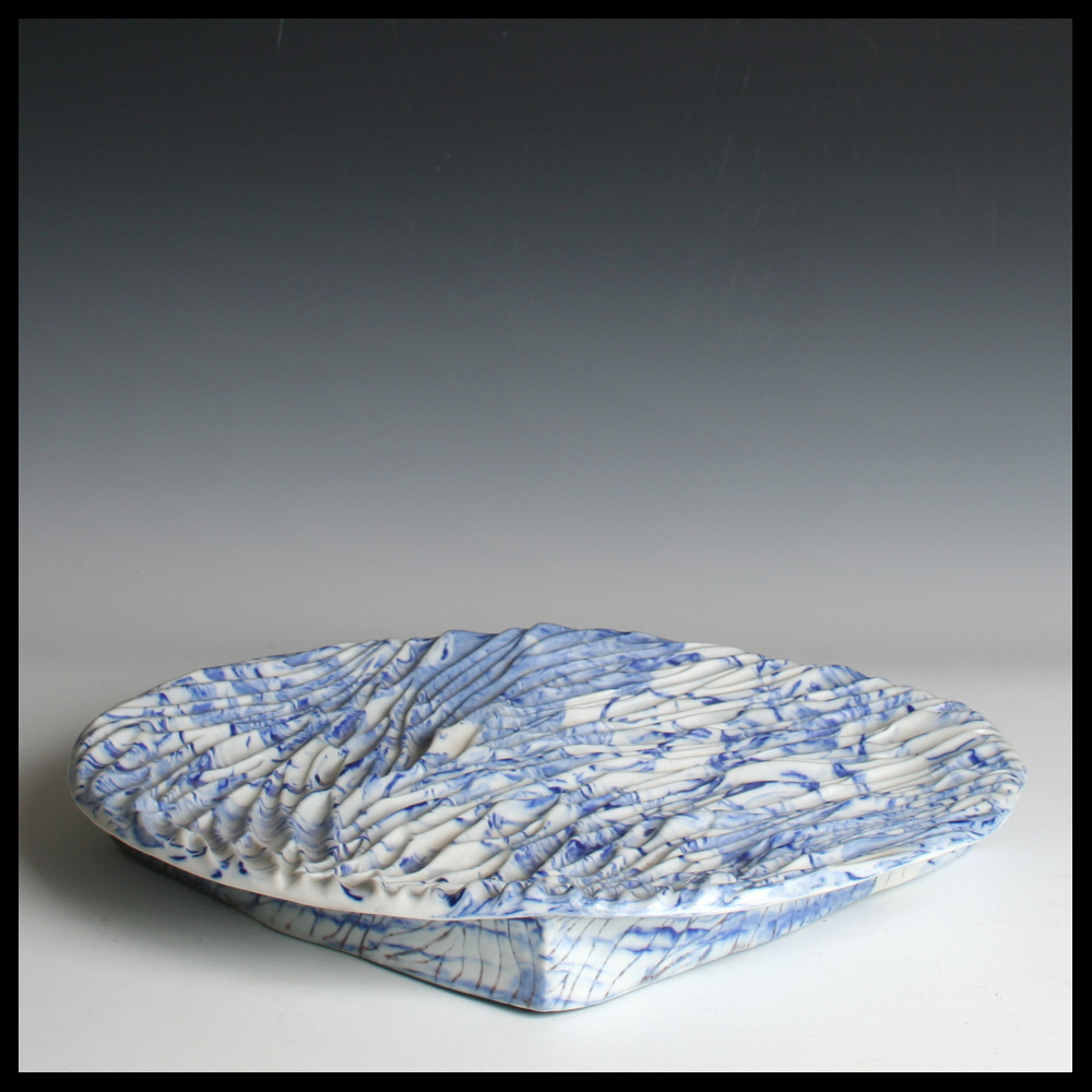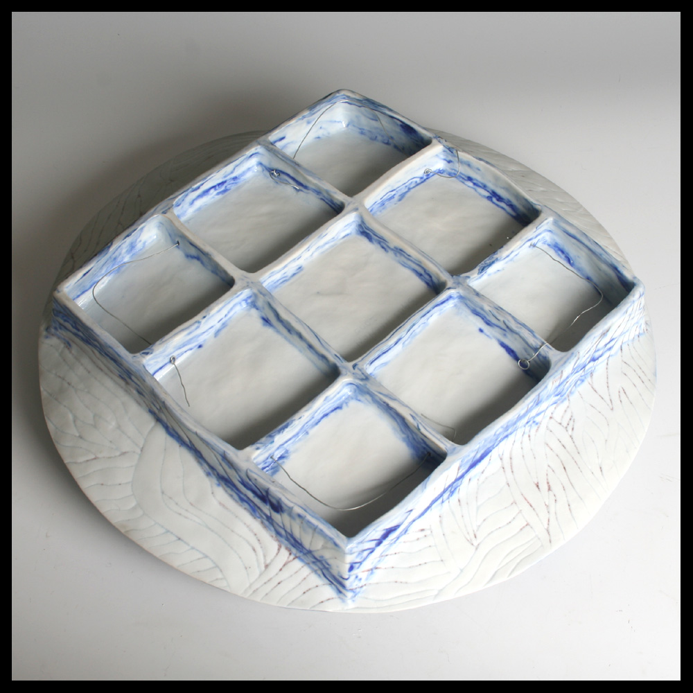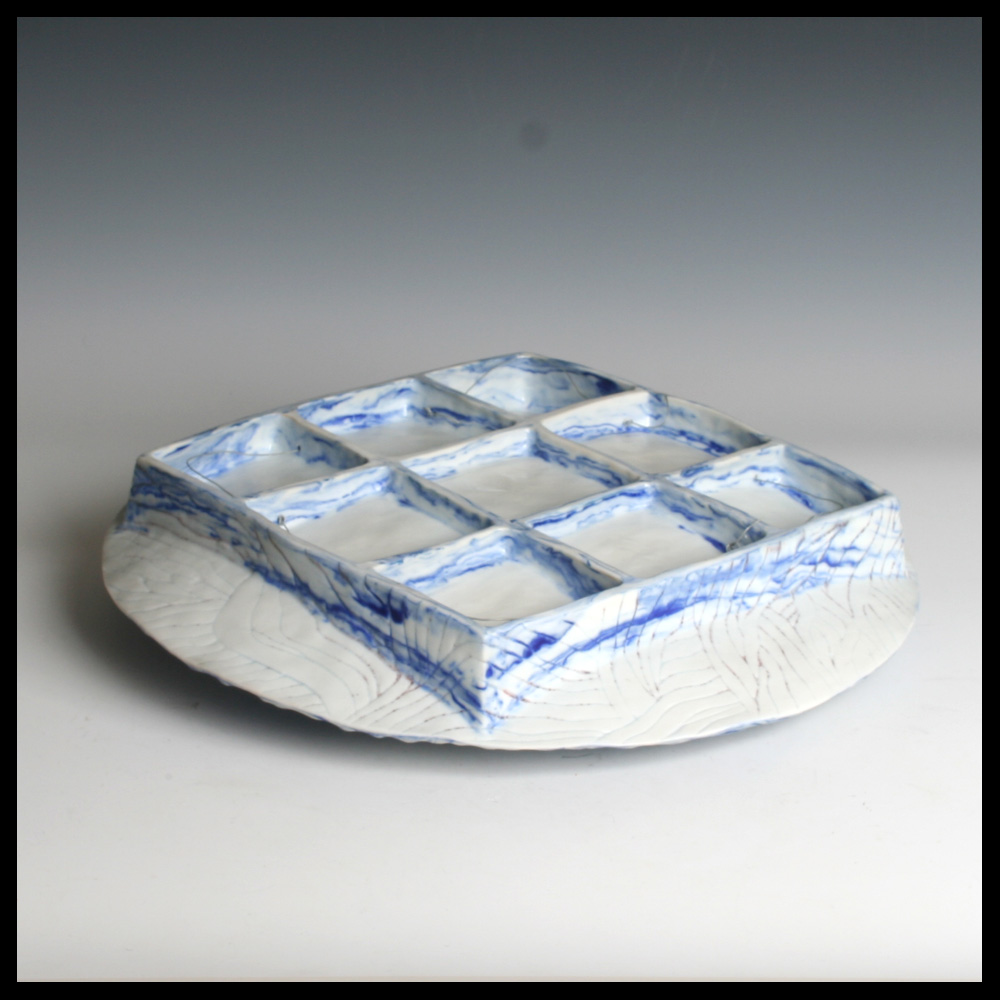 Babs Haenen (NL), tweezijdige schaal, met de hand gevormd, witte porseleinklei met blauwe pigmenten, de ene zijde met een golf decor, geinspireerd op de ribbels in het zand door de stroming in de Waddenzee, de andere zijde met negen bakjes. Het object kan eventueel ook hangen.