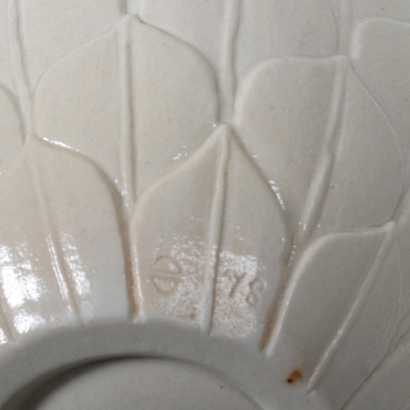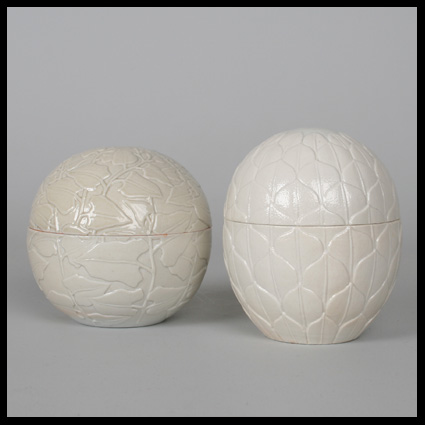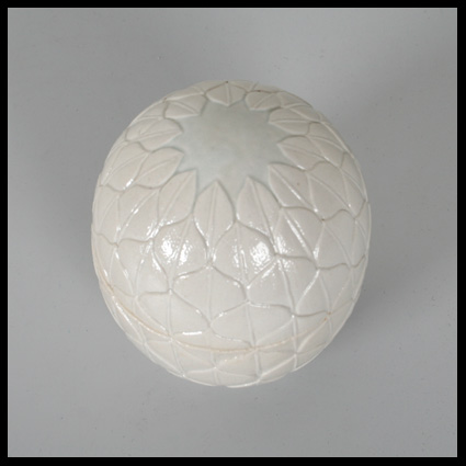 Beate Nieuwenburg-Reinheimer (1942), twee-delig dekseldoosje met uitgesneden decor van een lotusachtige bloem, porselein, zoutoven. “De vaasvormen van Beate Reinheimer zijn geïnspireerd op de verfijnde Chinese keramiek uit de Sung-dynastie. De laatste jaren is zij meer reliëf en kleur gaan gebruiken. De porseleinklei wordt gedraaid, ingekerfd en met zoutglazuur bedekt en gebakken in een zoutoven tot 1300 graden. Gebruikte technieken: porselein met zoutglazuur”. Tekst uit: Nederlandse Keramiek ’85, Museum Flehite, catalogus 1985.