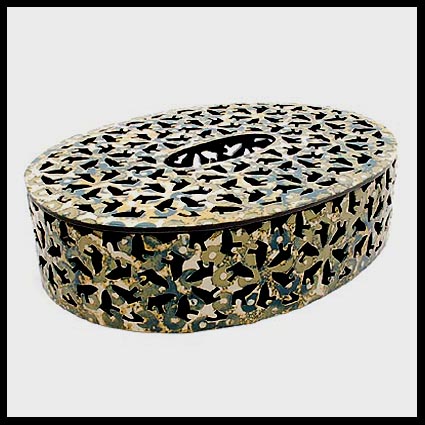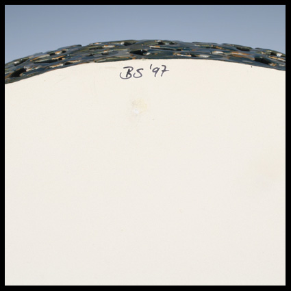 Bernice Schutte (NL), ovale dekseldoos, tafelstuk getiteld ‘Oog in Oog’, steengoedklei, gegoten in een mal, opengewerkte wand en deksel, gedecoreerd en geglazuurd, interieur mat antraciet grijs, onderzijde is de gietkleikleur, 1997; h.10,7 cm, breedte 42,2 cm, prachtige conditie.