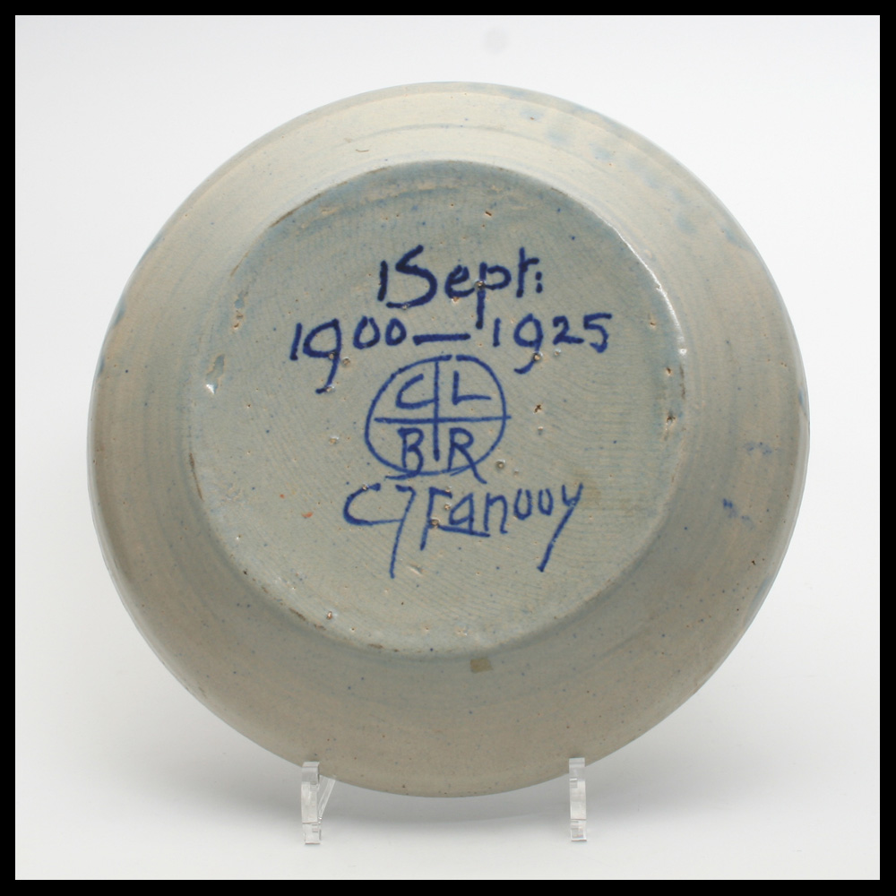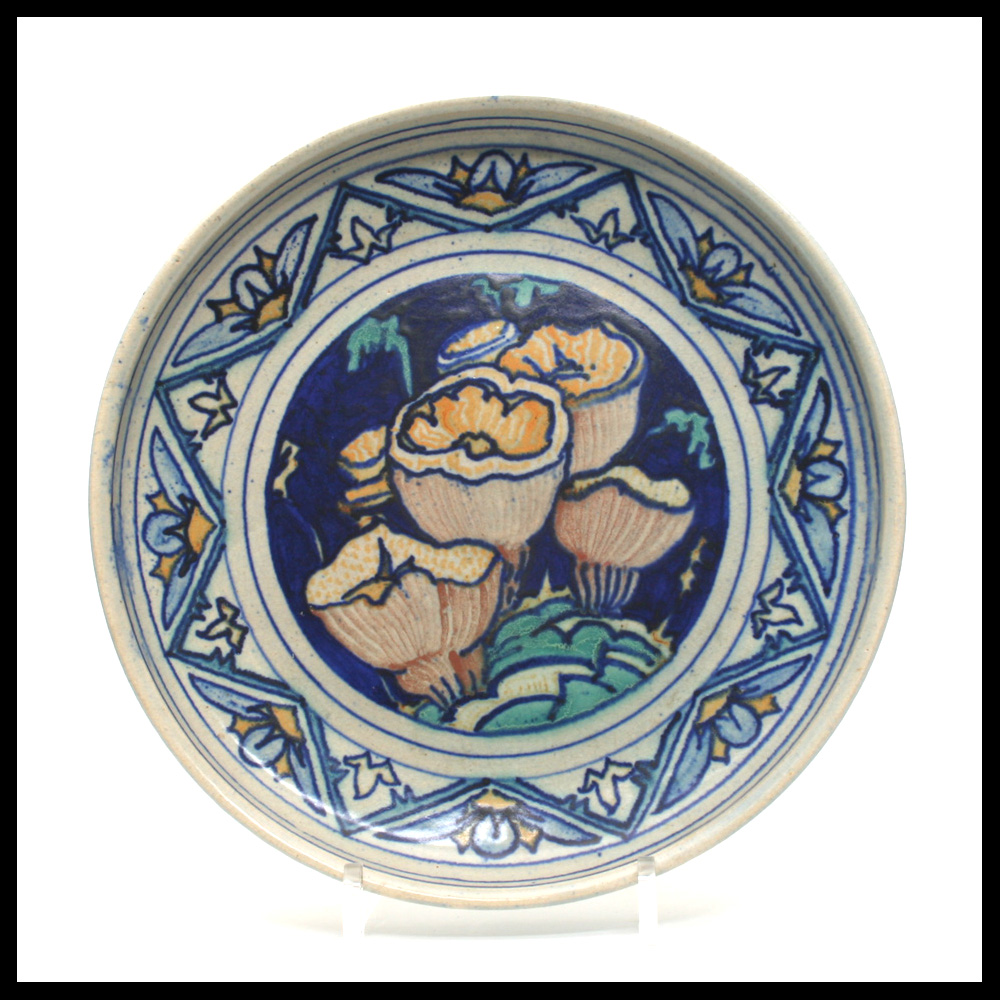 Chris Lanooy, een paddenstoelenbord, met de hand gedraaid, geen standring, decor geïnspireerd op een vroege 17e eeuwse majolicaschotels, centraal decor van bekerzwammen binnen een dubbele cirkel met daarom heen een zig-zag band met florale motieven, geschilderd met gebruikmaking van een ponsief, gedateerd 1 september 1900-1925.