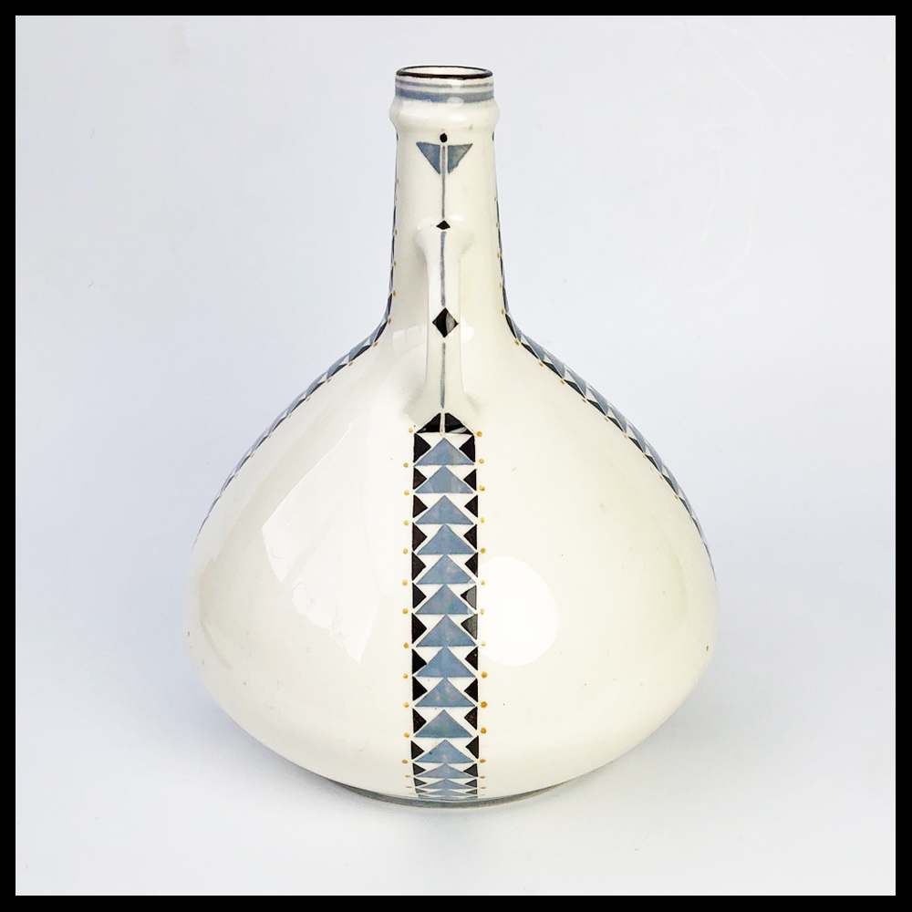 Chris van der Hoef voor Plateelbakkerij Zuid-Holland Gouda (NL), zeldzame flesvaas met twee oren, modelnr. 4264, gegoten in een mal, ivoorkleurige hoogglans glazuur, vier verticale stroken met een fijn handgeschilderd deels uitgespaard driehoek decor, dit decor loopt op de oren door in een lijndecoratie, hoogte 19,5 cm, diameter 16,7 cm, handgeschilderde signatuur, schilder ons niet bekend, ca. 1904. Dit product zou ontwikkeld zijn voor de bekende interieurinrichtingszaak De Woning te Amsterdam. Opmerking : lichte craquelures en enkele te verwaarlozen insluitingen, voornamelijk in het onderste deel.