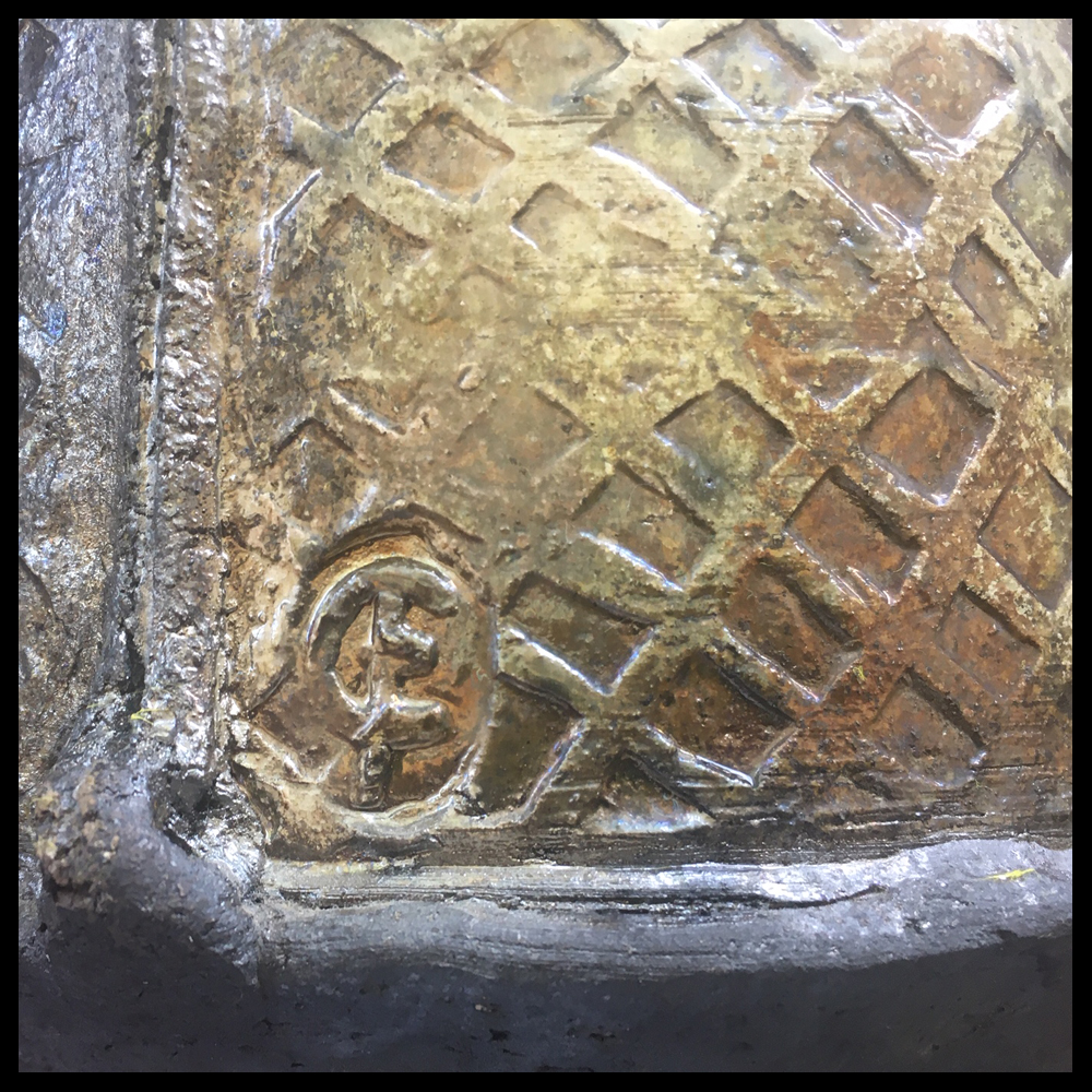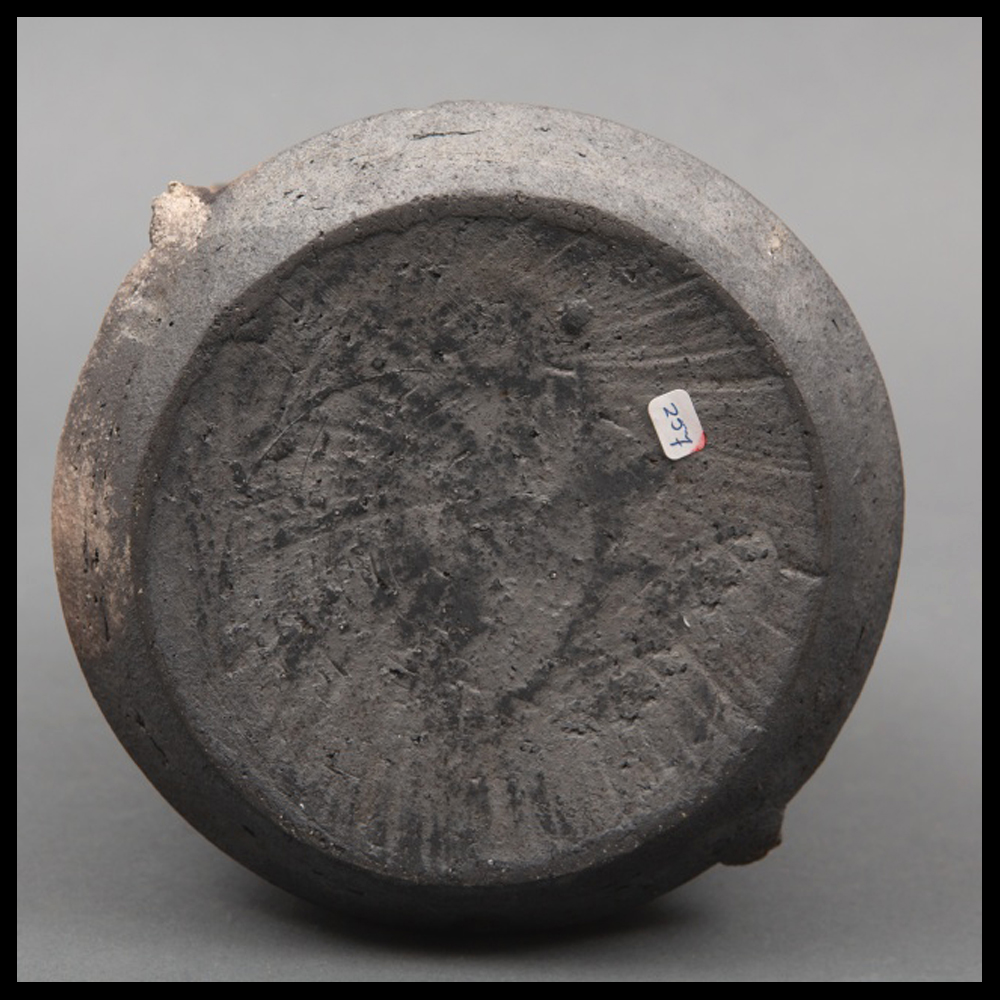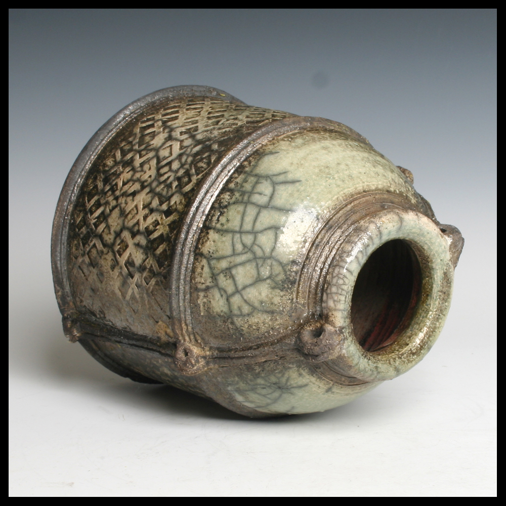 Christine Fabre (FR), een met de hand gedraaide vaas, Raku gestookt, Afrika invloed, onderste deel met diagonale afdrukken, bodem met diagonaal gesneden rand, horizontale en verticale banden, de laatste met ophanglussen, prachtige groen-bruine hoogglans glazuren, geperste kunstenaarsstempel, hoogte 18 cm, doorsnede 15,8 cm, jaren 1990-2000.