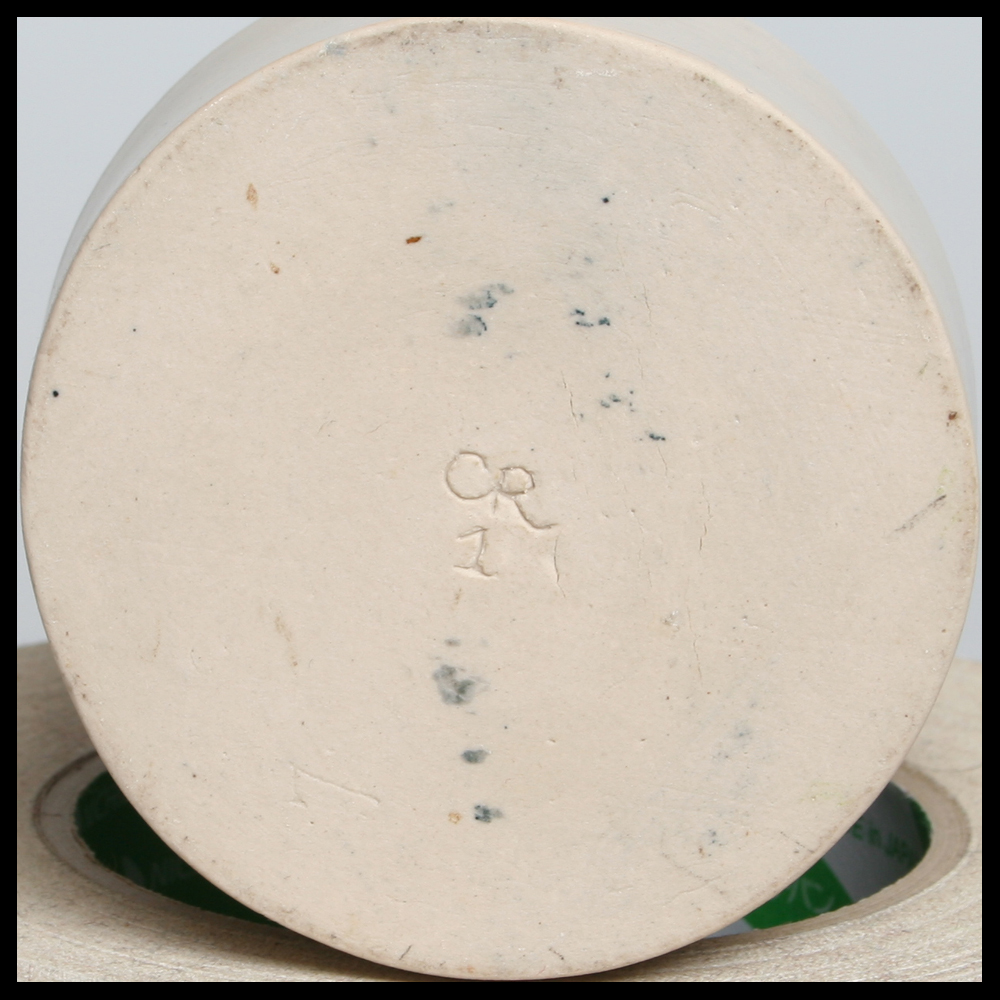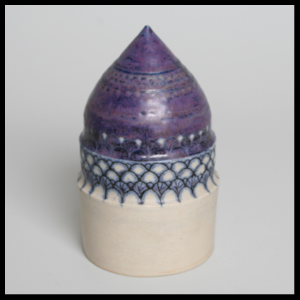 Corien Ridderikhoff is een perfectionist. Zij draait of vormt de keramiek op een heel precieze manier. En voor de decoratie heeft zij een zorgvuldige en vaste hand van inkrassen en invullen. En dat alles doet zij al zo veel jaren. Het hier aangeboden (borst)stuk kent diverse welvingen. Het bovenste gedeelte is paars geglazuurd met aan de onderzijde ervan een ingekraste decorrand. Het middengedeelte heeft een boogjesdecor, in blauw ingevuld. Het onderste einde is glad en mat geglazuurd. Steengoed, 1990s.