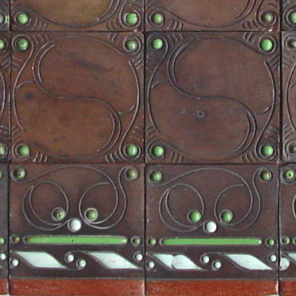 De Distel, Amsterdam – een groepje van in totaal twintig carduus tegels in twee decors. Roodbakkende klei, decor ingekrast en met glaspasta gedecoreerd. Uit de Amsterdamse periode.