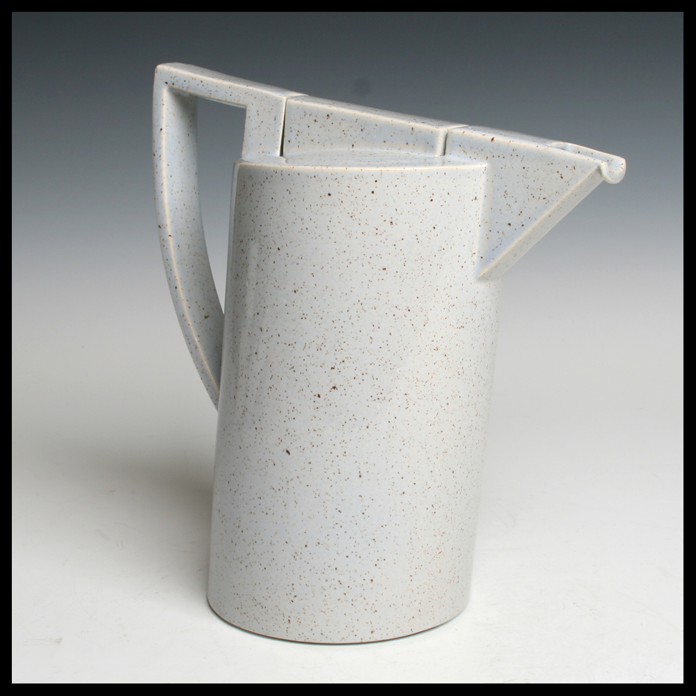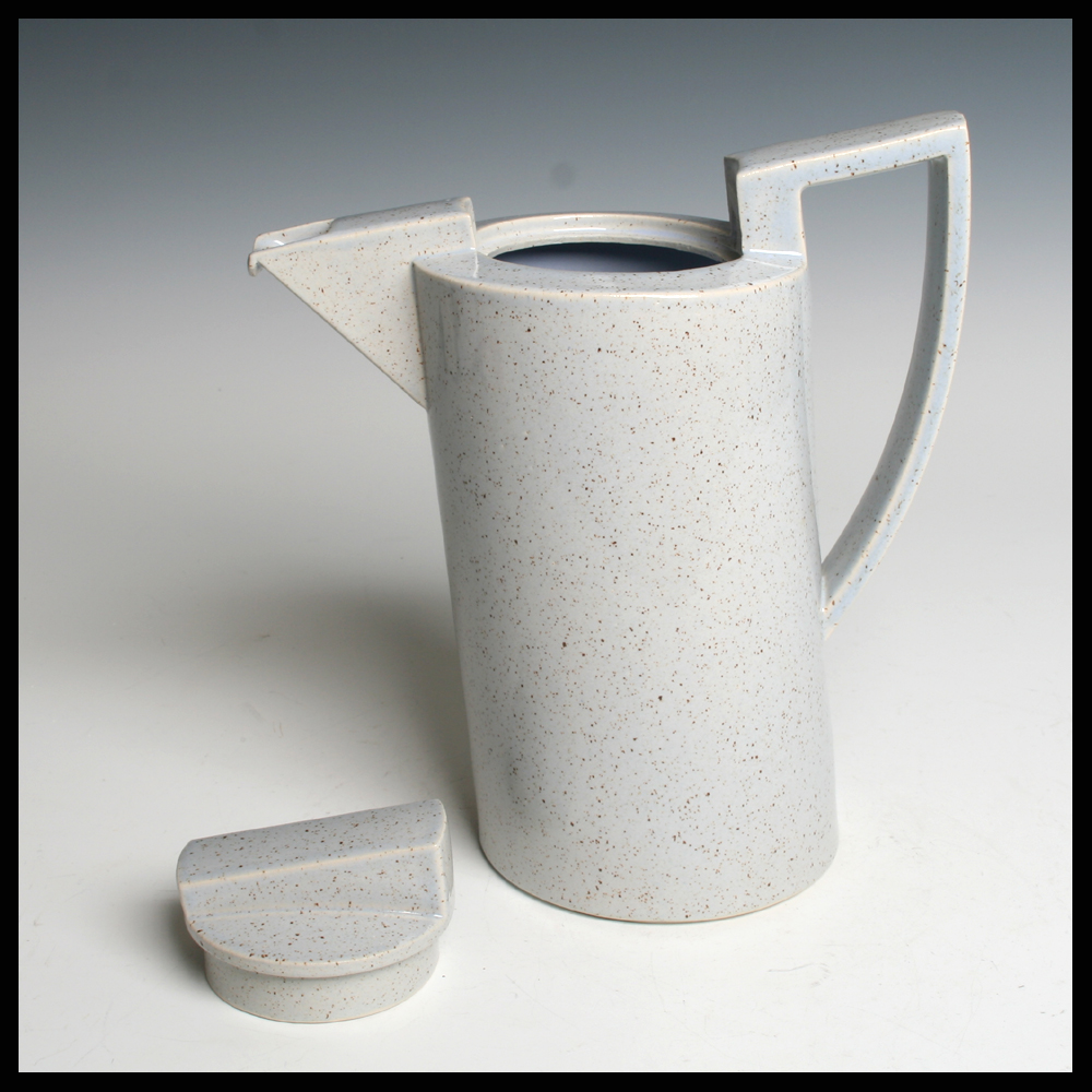 Dick Lion (NL/DE), dynamische leunende theepot, in een mal gegoten, steengoed klei, lichtgrijs geglazuurd, bruin gespat, hoogte 21,3 cm, 1985. Deze pot werd voor het eerst geëxposeerd bij Galerie Kapelhuis in Amersfoort in de expositie “Kijken naar keramek 8” in het voorjaar van 1984.