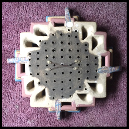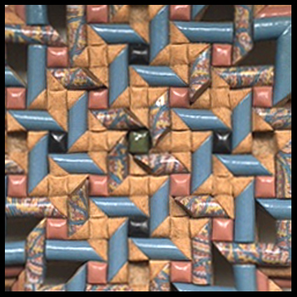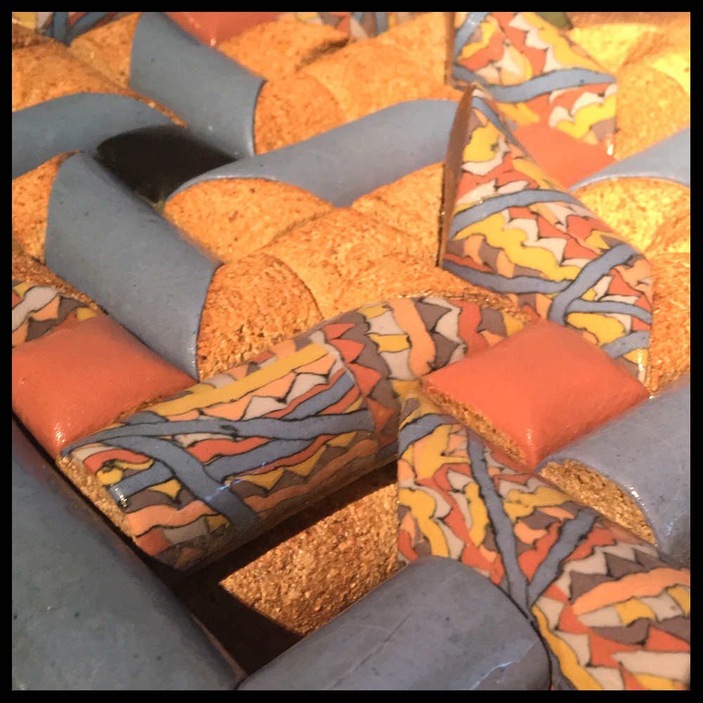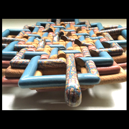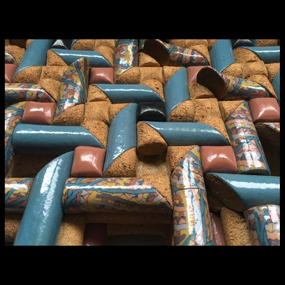 Elina Brandt-Hansen (NO) – zeer gecompliceerd en zeldzaam geometrisch keramisch werk, getiteld ‘Knot’, steengoed, met porselein decor toepassingen, elektrische oven, 500 x 495 x 90 mm, rond 1994. Het object kan aan de wand hangen. Let op: in verband met grootte en gewicht kan dit object alleen worden afgehaald aan de galerie.