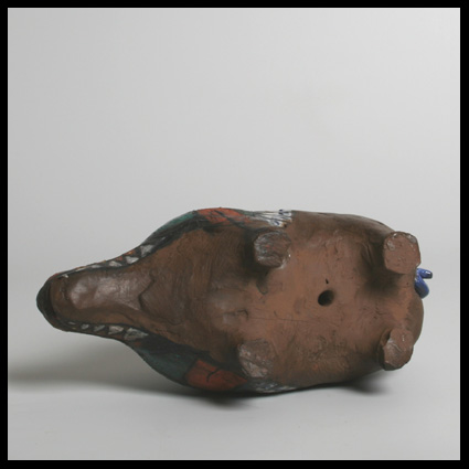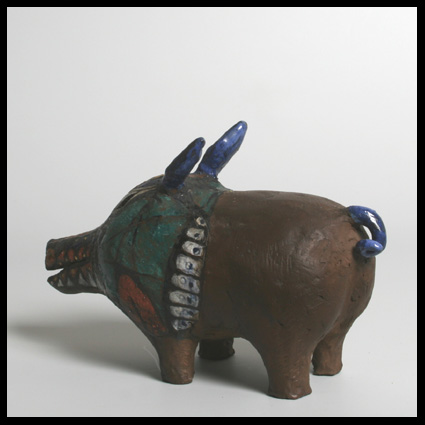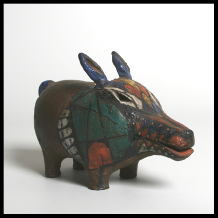 Etie van Rees – vrolijke plastiek van een aardvarkentje, bruinbakkende klei, voorste gedeelte gedecoreerd met opgeschilderde tanden en kenmerkend ruitendecor, engobes met plaatselijk hoogglans, oren en krulstaart blauw met hoogglans.