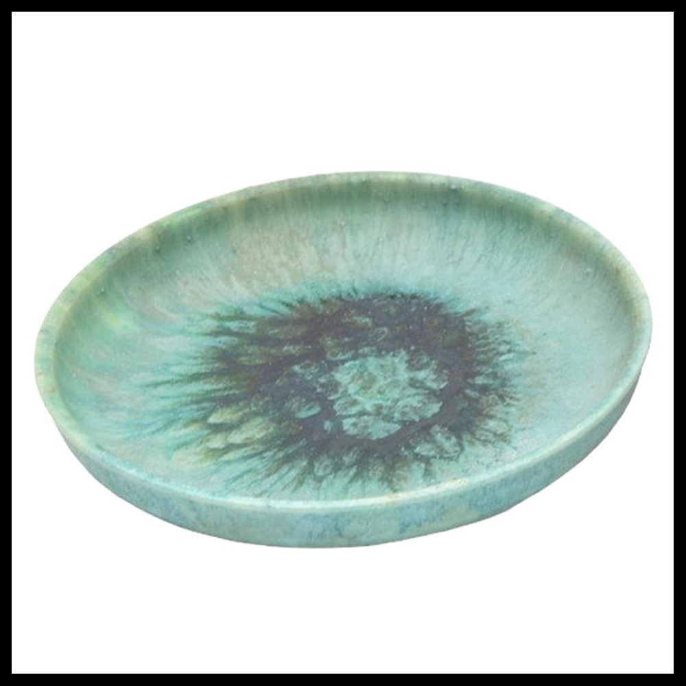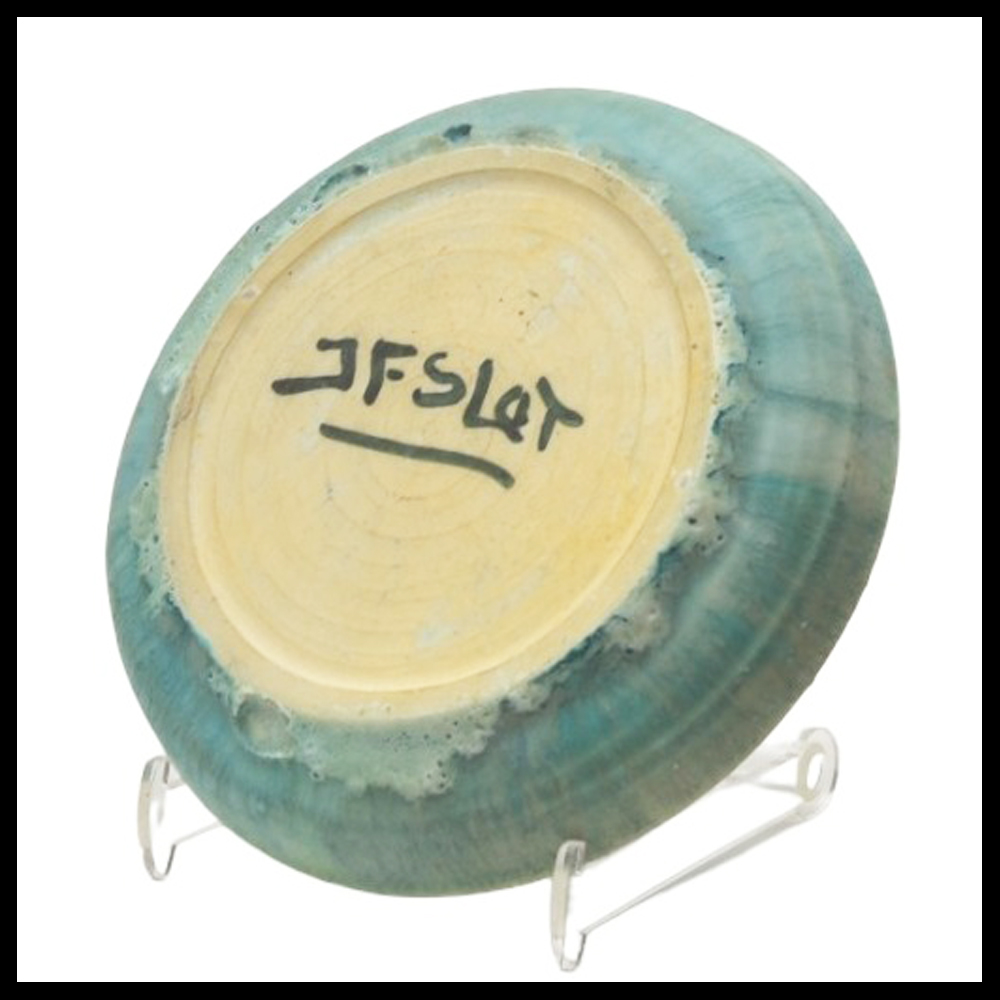 Frans Slot (NL), een op de schijf gedraaid sierschoteltje met opstaande rand, aardewerk, fraaie groene glazuur die naar de ziel toe donkerder stroomt, hoogte 2,3 cm, diameter 14,6 cm, geschilderde signatuur, 1950/1960. Opmerking: glazuur rond de standring heeft “gekookt”.