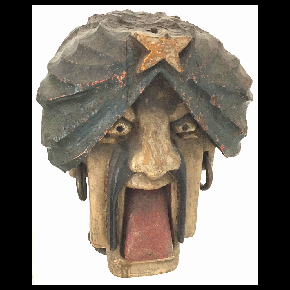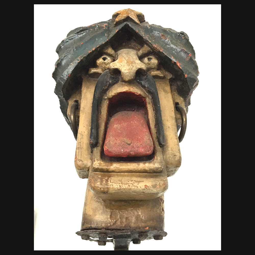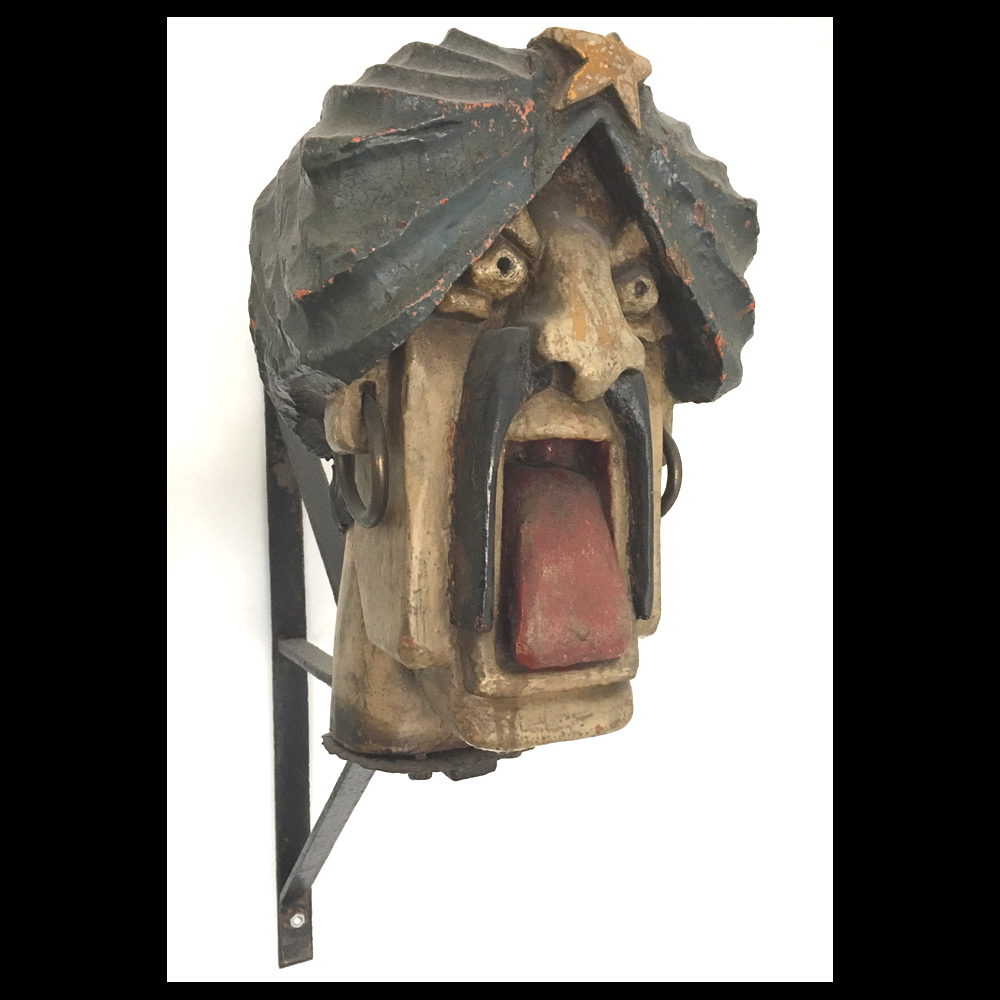 Gaper in de vorm van een Oosterse man met tulband en ster, hout met polychromie, op een smeedijzeren frame, als uithangbord functioneel geweest bij een drogisterij aan de Hubertrus Duyfhuysstraat te Zuilen, Utrecht, hoogte gaper 38 cm, hoogte gaper inclusief frame 61 cm, 1920s.