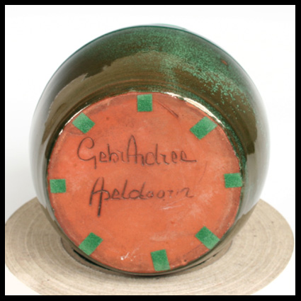 Elegante vaas met stroomglazuren in twee kleuren groen over een bruine ondergrond, waarschijnlijk al invloed of werk van de experimenterende zoon Johannes (Hein). Aardewerk, handgedraaid, roodbakkend, met uitlopende kraag. Schade: glazuurafbrokkeling op twee plaatsen aan de hals.