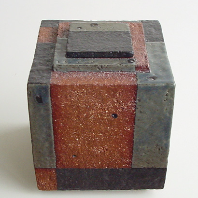 Gerlach van Beinum bouwde deze intrigerende doosvorm met de hand op uit rollen rode chamotteklei in circa 1987. Er werd aan de bovenzijde een verhoogd gedeelte geplaatst met opening voor een losse deksel. Aan de onderzijde vormde de kunstenaar een vierkante voet. Op geselecteerde plaatsen werden twee verschillend gekleurde engobes in strakke blokken toegepast. In de glazuur (Nepheline Syenite glazuur) werden smeltkorrels toegepast. Het object werd steengoed gestookt op 1250 graden C.
