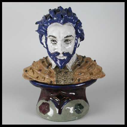 Gert Snijder (NL – Arnhem 1940), een zeldzame en imposante buste op pedestal van Sir Walter Raleigh, twee-delig, steengoedklei, geglazuurd, gesigneerd met W12 (werk 12) en Gert Snijder. Gert Snijder volgt de Kunstacademie te Arnhem en is een zeer getalenteerde leerling van Nicolaas van Os van 1989 tot 2001. Daarna moet hij om gezondheidsredenen stoppen. Deze buste heeft in de ovens van Nicolaas van Os in Amerongen het vuur gezien. Foto van buste met zwarte achtergrond werd ons gezonden door Hans van den Berg, waarvoor hartelijke dank!