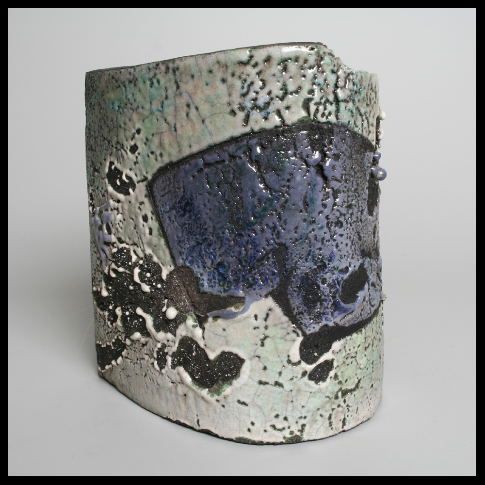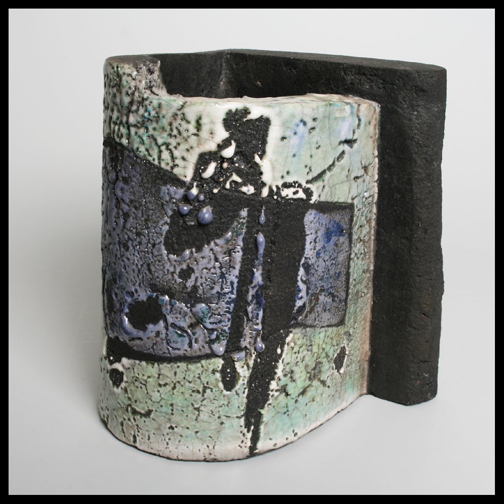 Haguiko (1948) is een Japans/Franse keramiste. Het hoekstuk dat wij hier aanbieden is uit platen klei opgebouwd en heeft een gedeeltelijke hoek- en gedeeltelijk ronde vorm. Dit in RAKU techniek gestookte object heeft een dikke glazuur in “wax resist” decoratie. Haguiko had in 1997 haar eerste verkoopexpositie in Nederland bij Loes & Reinier International Ceramics in Deventer (NL). Over Haguiko werd in 1948 in Saga, Japan, geboren. Zij doet daar een opleiding in architectuur. In 1972 verhuist zij naar Frankrijk. Hier bezoekt zij de L’école des Beaux-Arts in Tours, afdeling ‘décoration’. Hier leert zij haar toekomstige partner Jean-Pierre Viot kennen. Bij Viot en de Amerikaanse keramist Paul Sodner leert zij het vak van keramiste. Haguiko ontvangt de Prix Liliane Bettencourt. Haguiko en Viot zijn in onderstaande URL te zien. http://www.tv5.org/cms/chaine-francophone/publications/Sur-mesures/Video/p-15216-Episode-25-Jean-Pierre-Viot-et-Haguiko-ceramistes.htm