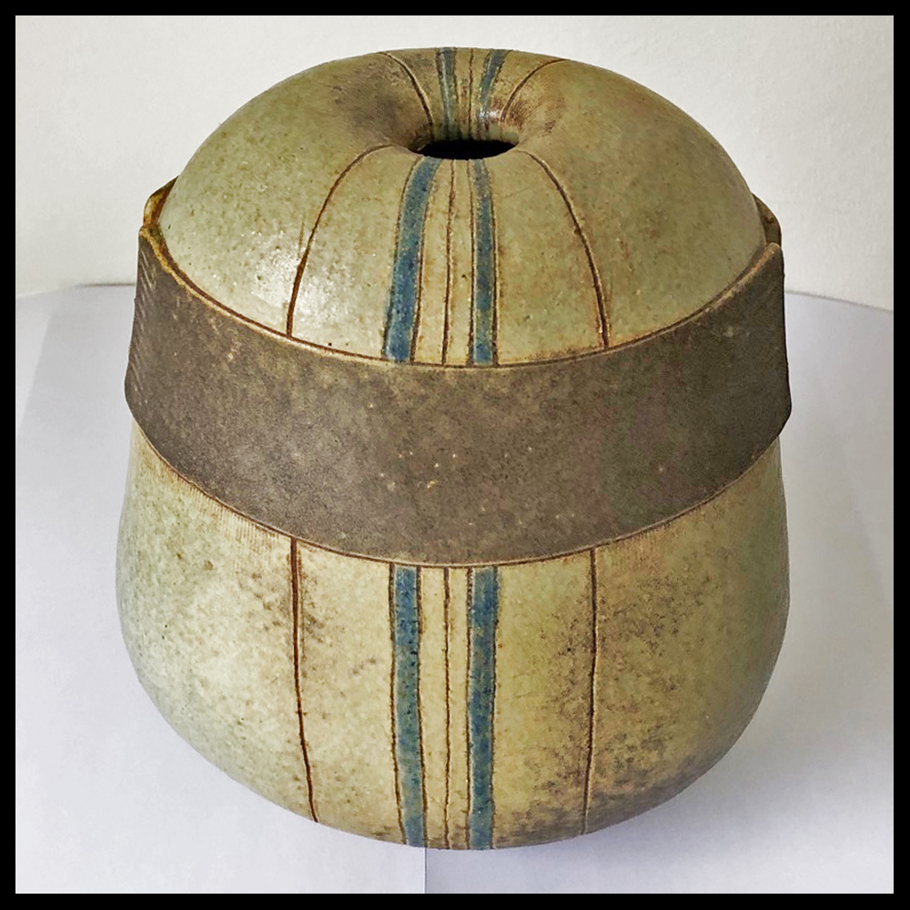 Hans de Jong (NL), “Beemster” ovale vaasvorm, op de schijf gedraaid en ovaal gemodelleerd, steengoed, verticale ingekraste lijnen en deels blauw geglazuurd (de sloten van de polder), mat bronskleurige horizontale brede band, hoogte 21 cm, breedte 17 cm, diepte 12,5 cm, kunstenaarsstempel, en ingekrast 1981.
