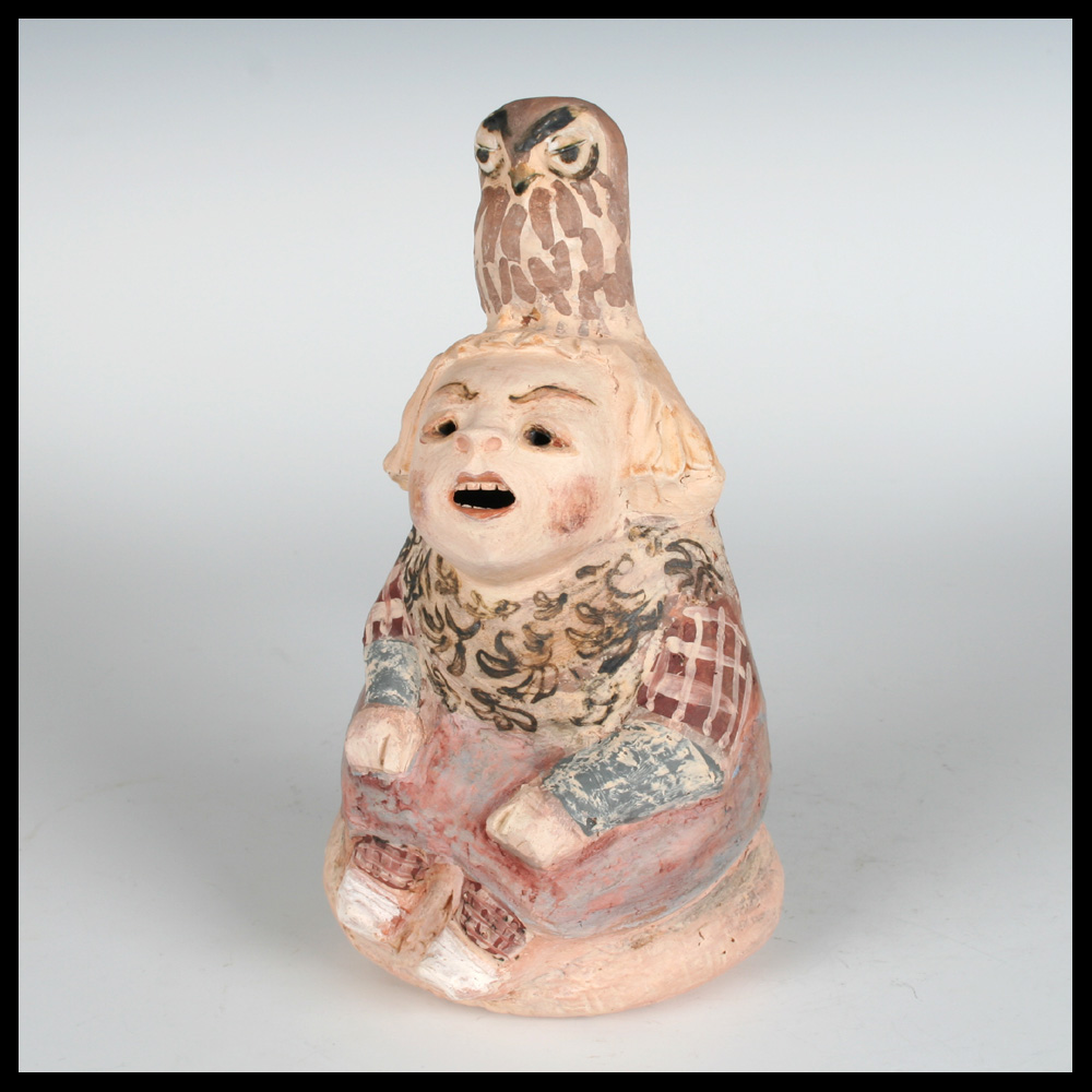 Heidi Daamen (NL) – Plastiek van zittende ‘Boerenmeid met uil’, handgevormd, gedecoreerd met engobes, geheel gaaf. Door de eerste eigenares aangekocht bij Galerie Jas te Utrecht. Rekening aanwezig.