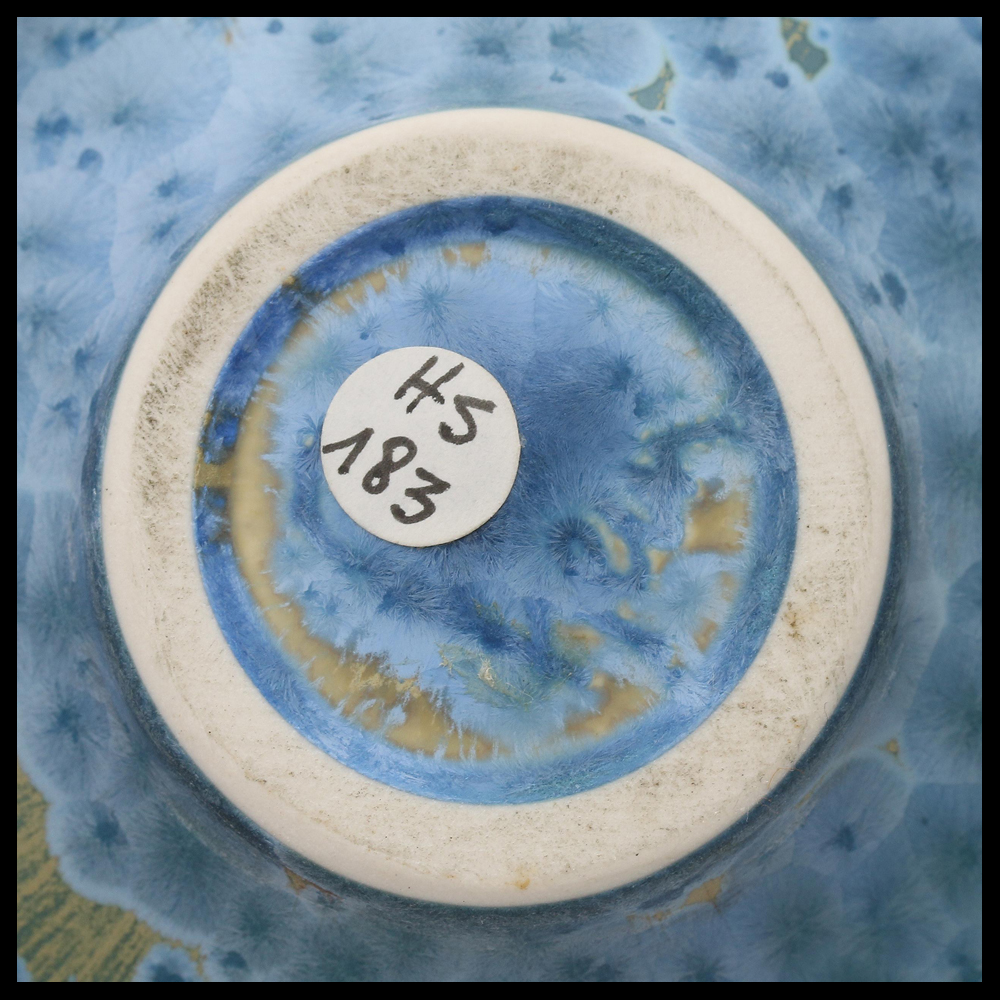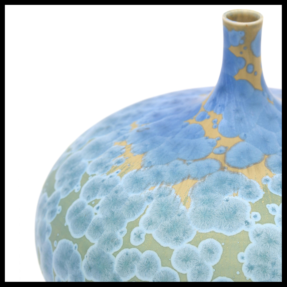 Hein Severijns (NL), buikvaasje met hoge hals en kleine mond, met de hand gedraaid, porselein, hoogte 11 cm, 1990s. Opmerking: Hein Severijns heeft zich het thema vazen met hoge tuitmonden in allerlei vormen en pastelkleurige kristalglazuren eigen gemaakt. Zijn werken zijn heel herkenbaar. Dit kleine vaasje met zeer fraaie glazuur is relatief zeldzaam.