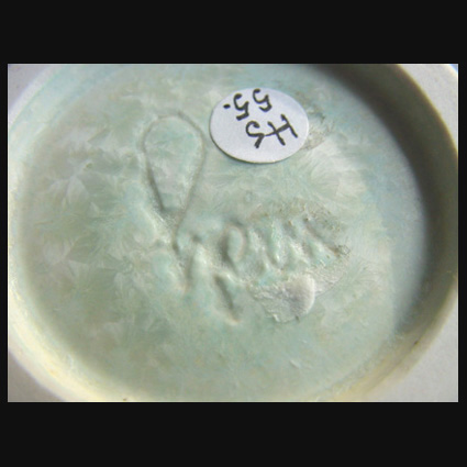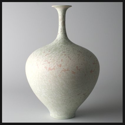 Hein Severijns is bekend voor zijn elegante vormen op smalle voet in combinatie met magische kristalglazuren. Hier heeft hij de vorm breed laten uitlopen aan de schouder en weer uiterst smal laten eindigen in de hals met uitlopende mond. De zacht groene kristalglazuren op een rozige ondergrond maken deze vaas tot één van de best gelukte van de laatste tien jaar.