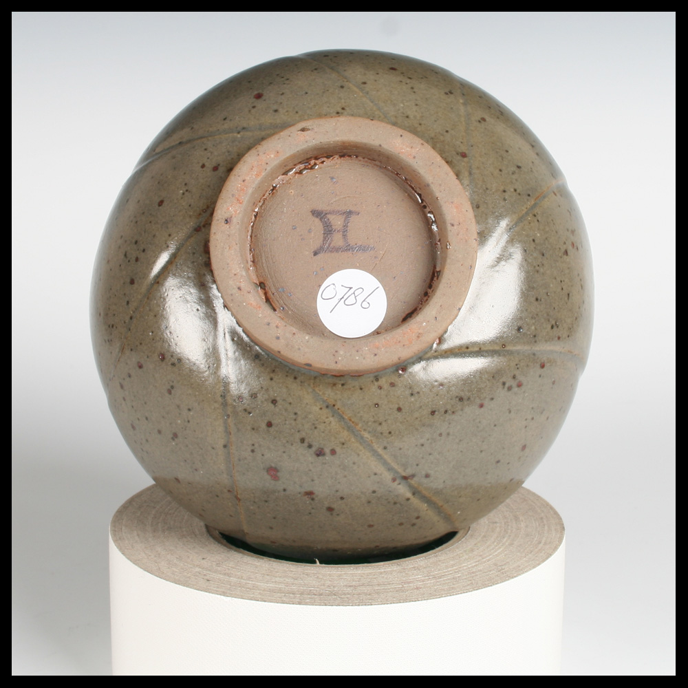 Henriëtte Syatauw, een bolle vaas op standring met uitlopende kraag, steengoed, groengrijze glazuur met roestkleurige insluitingen, vanuit de hals golvende insnijdingen, 1970s, hoogte 19 cm.