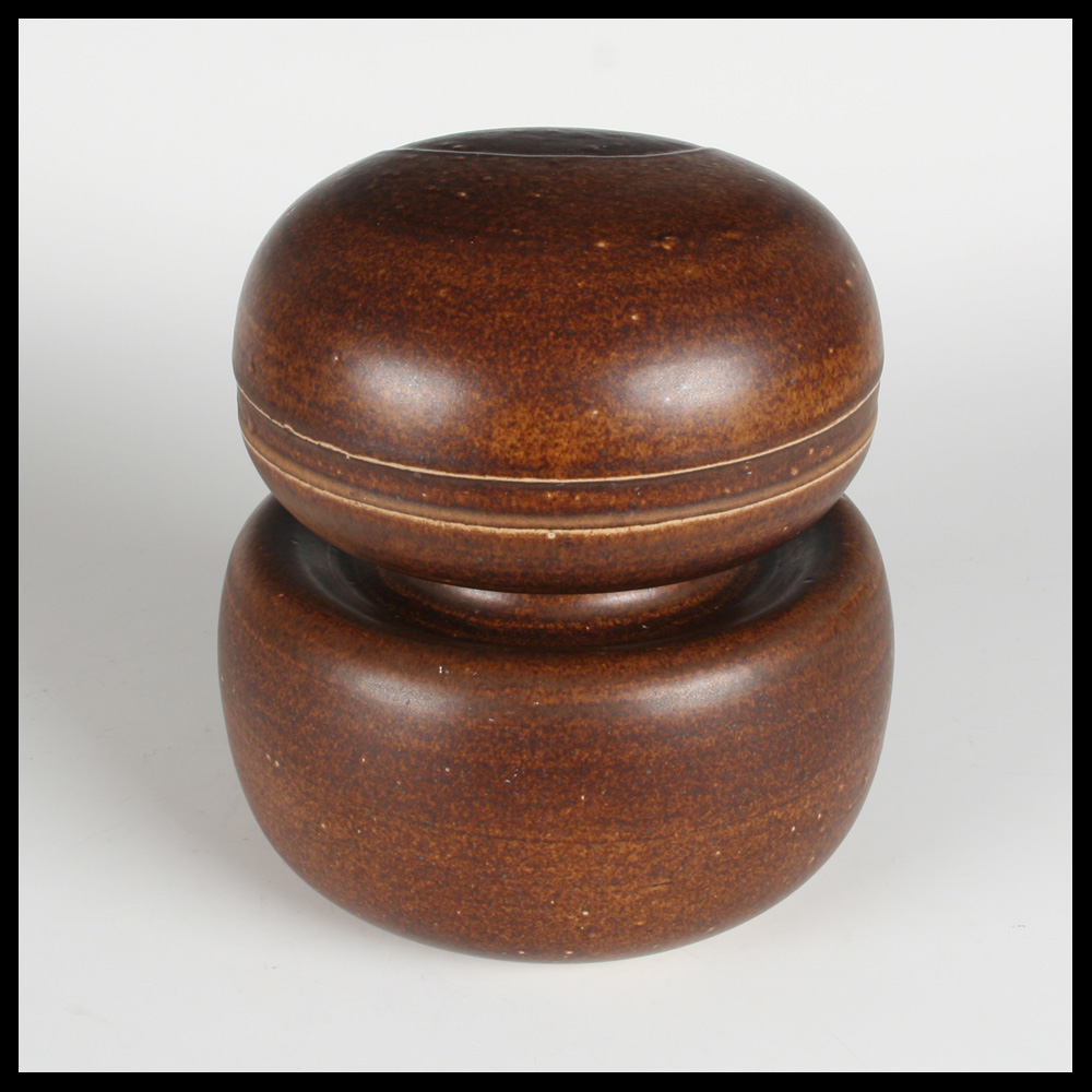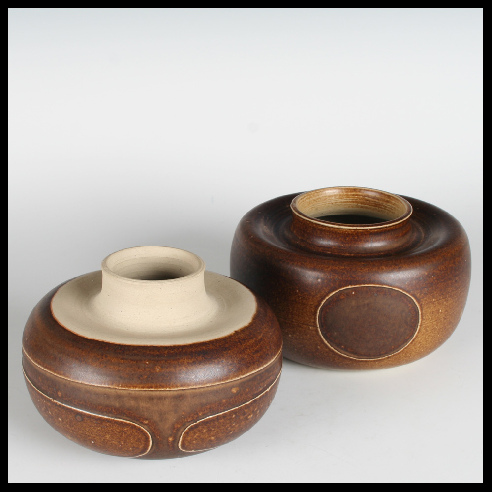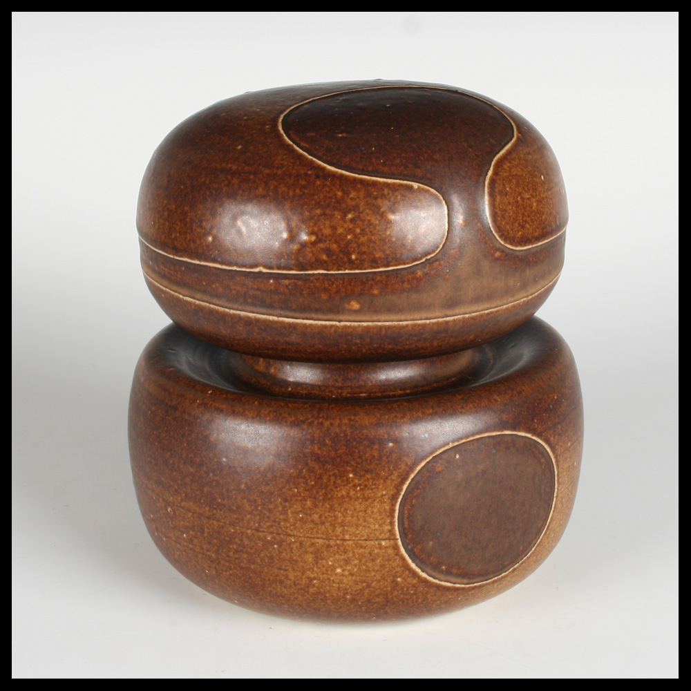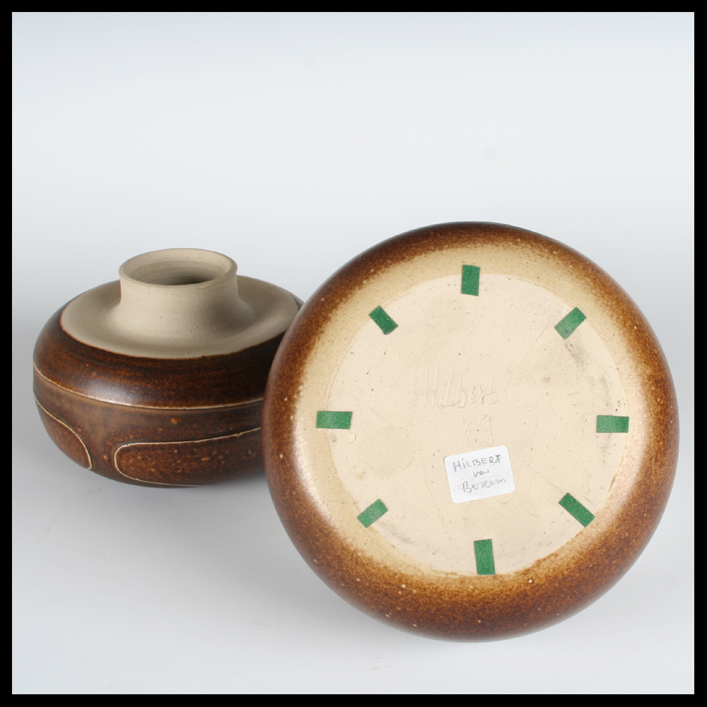 Hilbert Boxem (NL), twee champignonvormige keramische delen, samen een ruimtelijk plastiek vormend, handgedraaid, steengoed, de decors zijn iets terugliggend door klei weg te snijden, er ontstaan daardoor als het ware dijkjes, waarbinnen de glazuur van een iets afwijkende kleur bruin is, ingekraste signatuur aan de onderzijde HILBERT en datering (19)69.