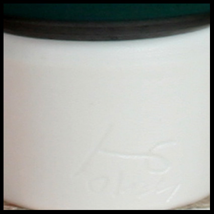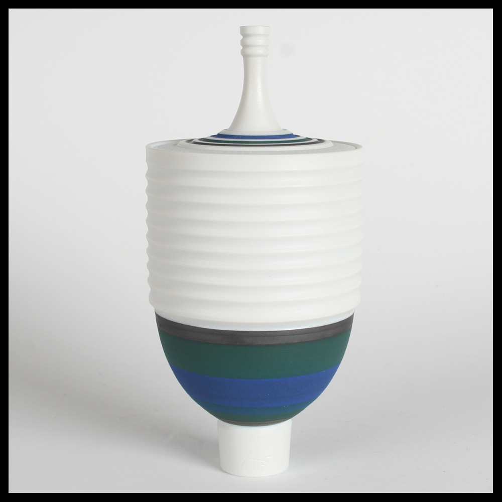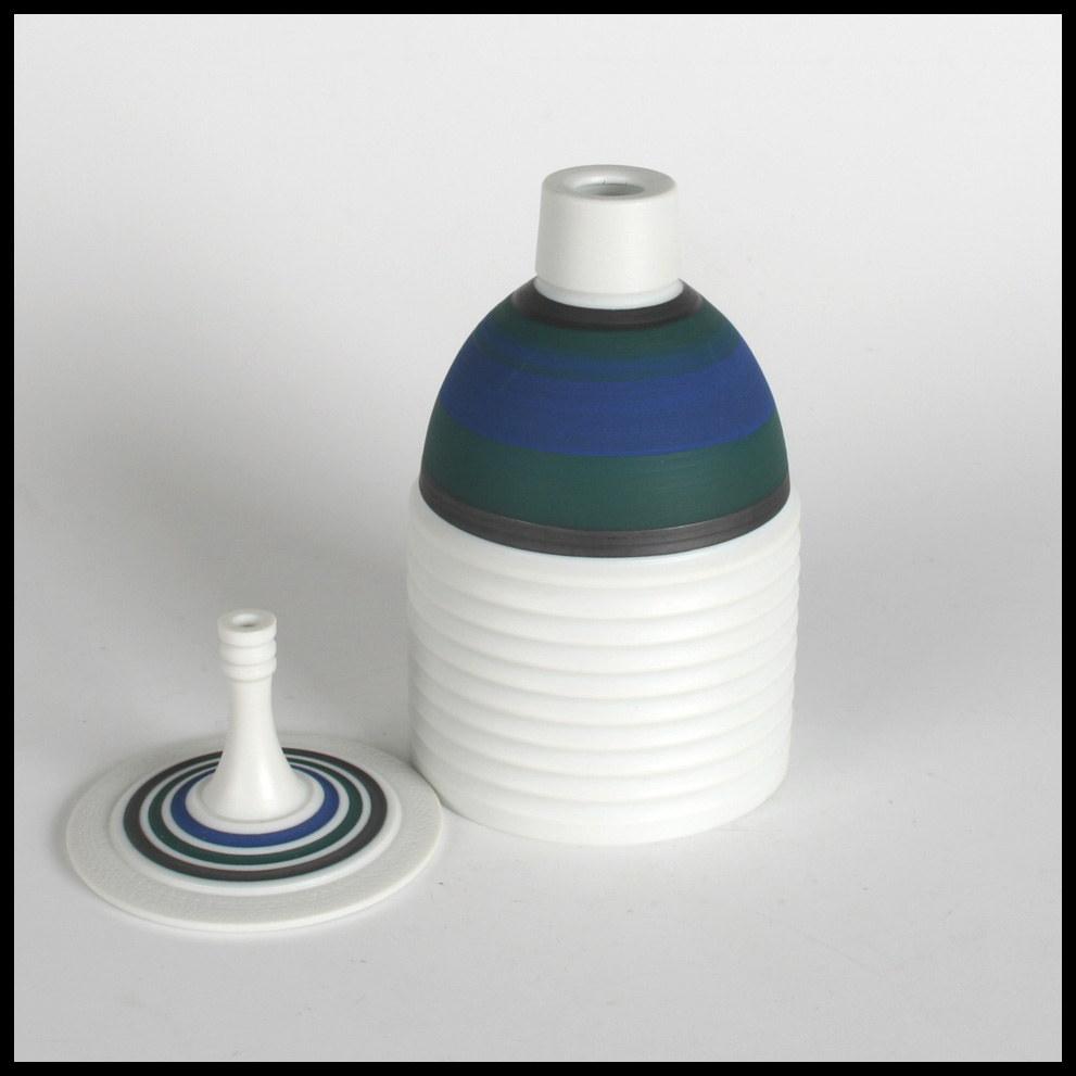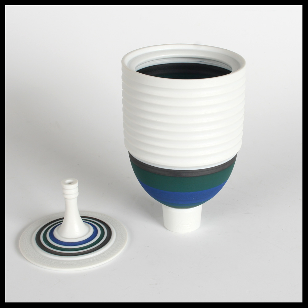 Horst Göbbels (DE) – geribd dekselvaasje op hoge voet, handgedraaid, porselein, aan de buiten onderzijde met matte glazuren in blauw groen en zwart gedecoreerd, het interieur geheel gedecoreerd met horizontale matte banen in groen, blauw en zwart, het dekseltje met een hoge greep en terugkerende geglazuurde cirkeltjes met bewerking aan de rand.