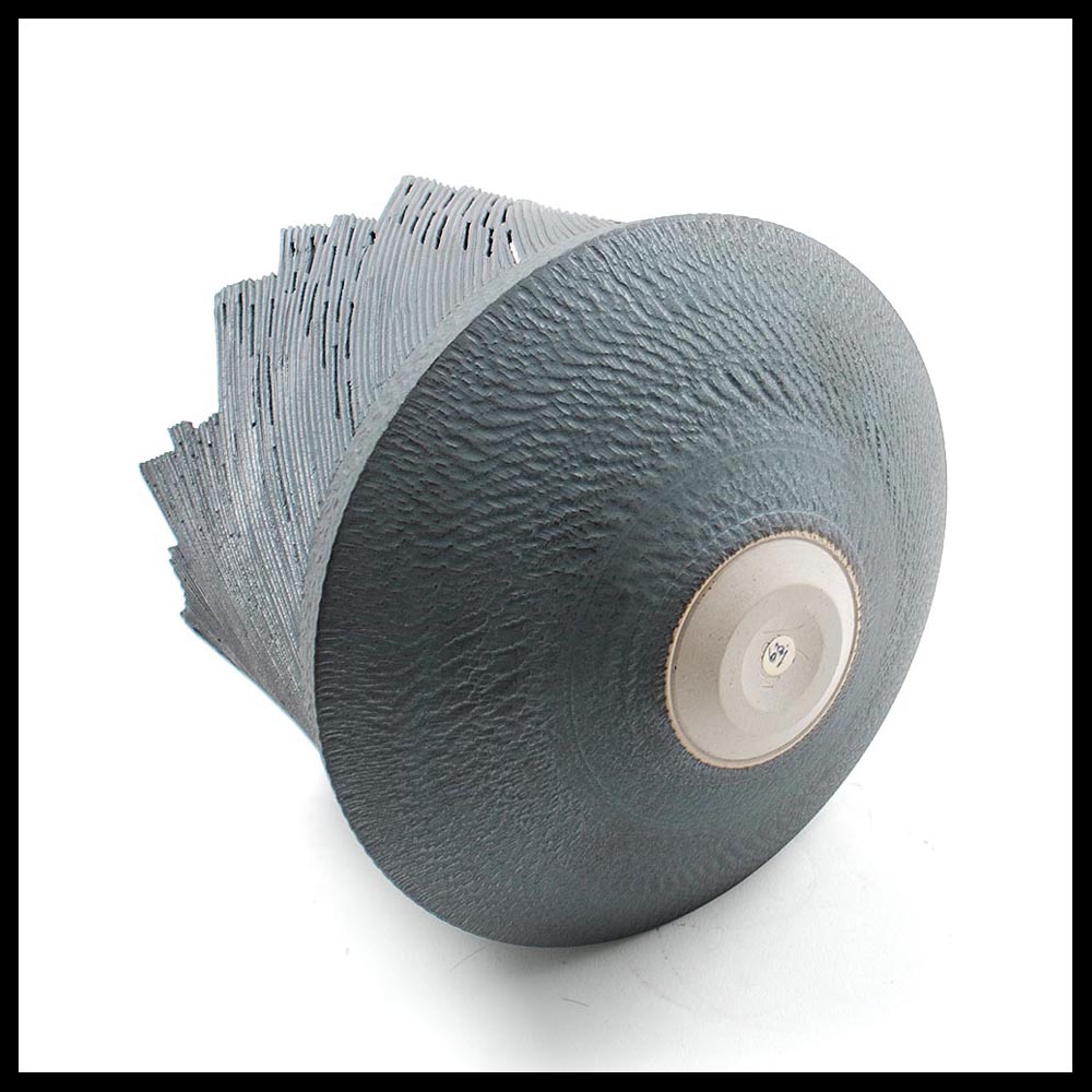 Horst Göbbels, Krefeld (DE) – Vaas, met de hand gedraaid, donker grijze klei, het onderste gedeelte met een reliëf decor, het bovenste gedeelte met een diagonaal reliëfdecor waarbij uit de leerharde nog ongebakken scherf deeltjes zijn uitgezaagd, de bovenzijde is hoekig afgewerkt. Hoogte 16 cm, diameter 18 cm, 2000s.