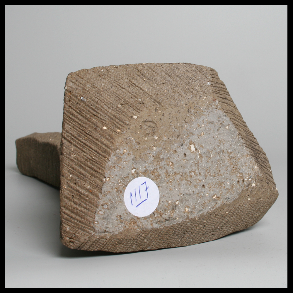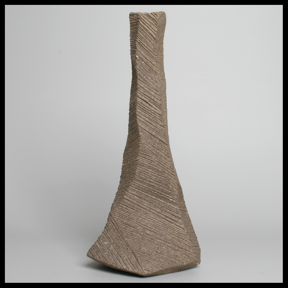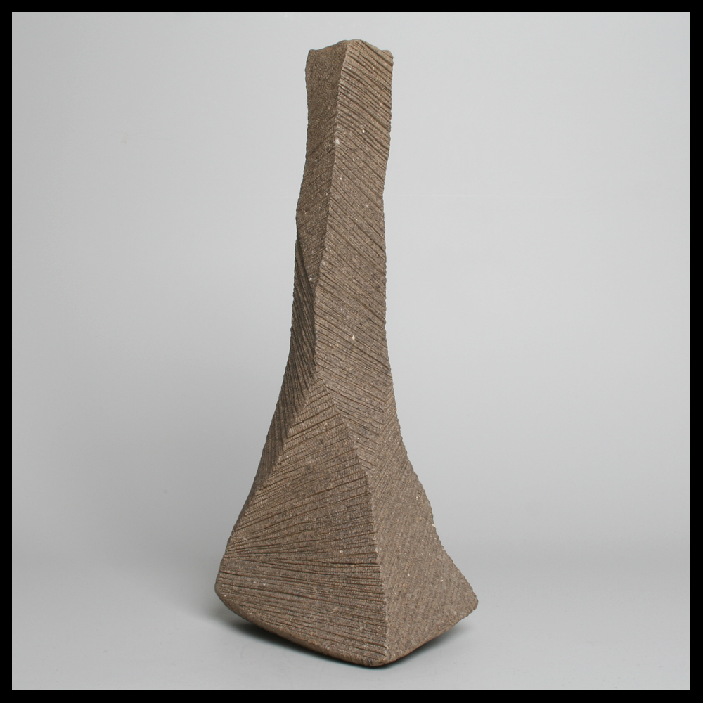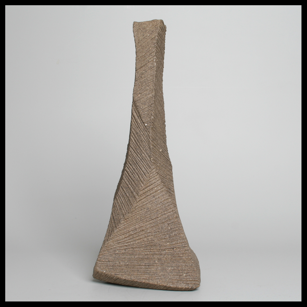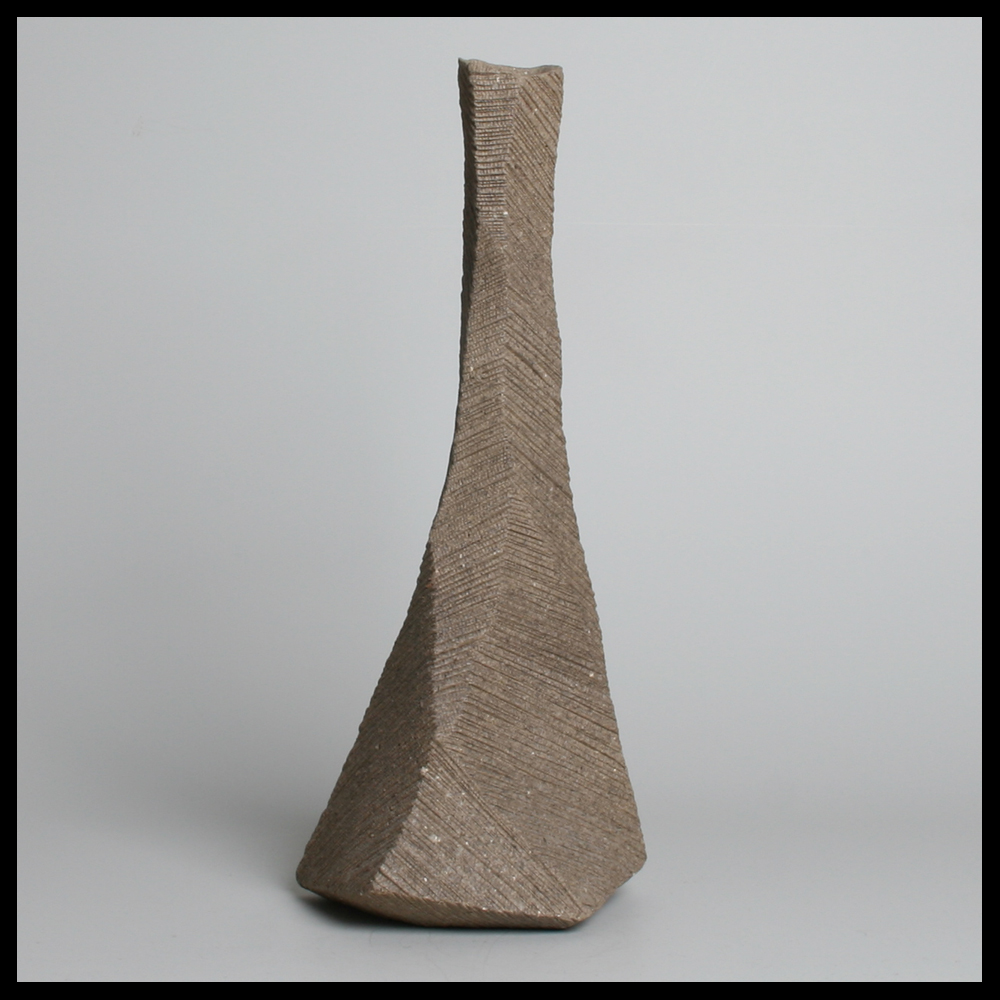 Hoshino Kayoko (Japan, 1949) – een verbazingwekkende meerzijdige autonome vorm met een vaasfunctie, uit het hoofd gebeeldhouwd door de beroemde Japanse keramiste Hoshino Kayoko. Alle zijden met een grijsbruine gesneden huid. Wanneer je het object draait, dan ontdek je de vele gezichten van dit object. Een stuk dat het bestuderen en aandachtig genieten waard is. Dit object is door de eerste eigenaar aangekocht bij Galerie Carla Koch te Amsterdam. Technische details: de klei is afkomstig van een plaatselijke beek, deze is rijk aan fijne stenen, handgemaakt, versierd met zaagsneden, oxiderend gestookt waarbij in een deel van het stookproces gas is ingebracht voor een reducerende atmosfeer.