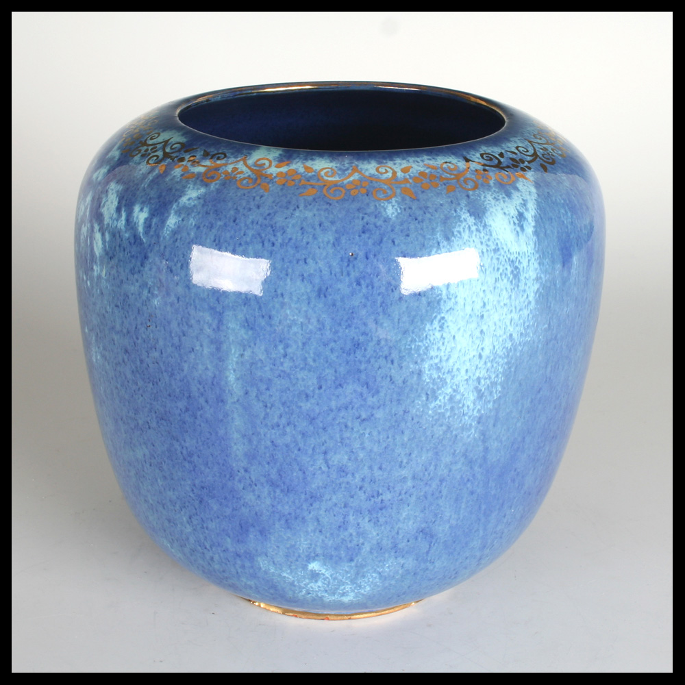 Iet Glerum was een verdienstelijke keramist en leerling van Bert Nienhuis aan de Quellinus School te Amsterdam. Het is niet duidelijk of zij ook de Teekenschool in die stad heeft gevolgd. In ieder geval heeft zij met deze fraaie vaas een bijzonder stuk afgeleverd. Het begint met de vorm van de vaas, de fraaie stroomglazueren in blauwtonen. Het tweede stookproces is voor de gouddecoratie nog eens gevolgd door een derde stookgang in de moffeloven. Deze decoratie bestaat uit een met de hand geschilderde bladrand langs de bovenzijde. In het aangezicht twee staande en een liggend paard met de tekst: ” Men kijkt een gegeven paard niet in de bek.”