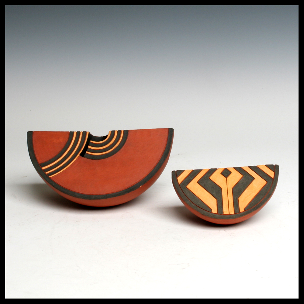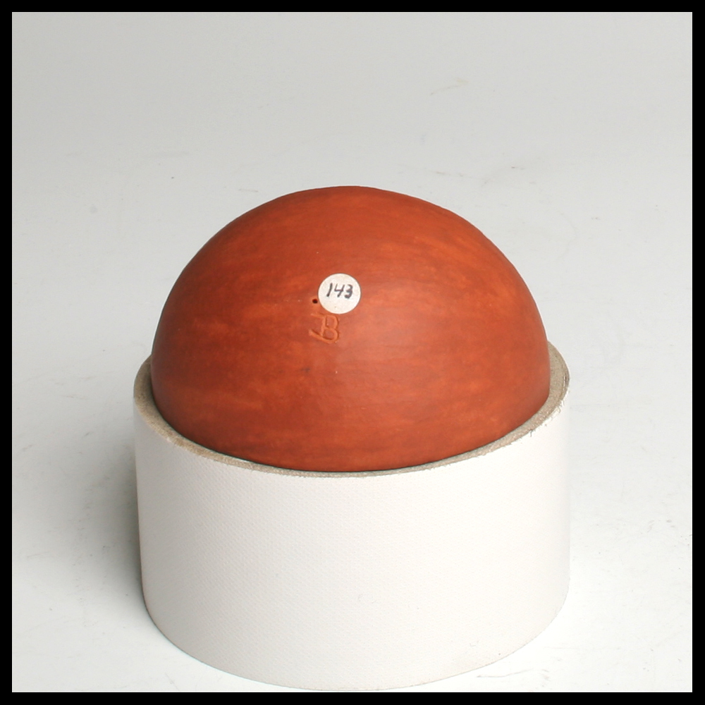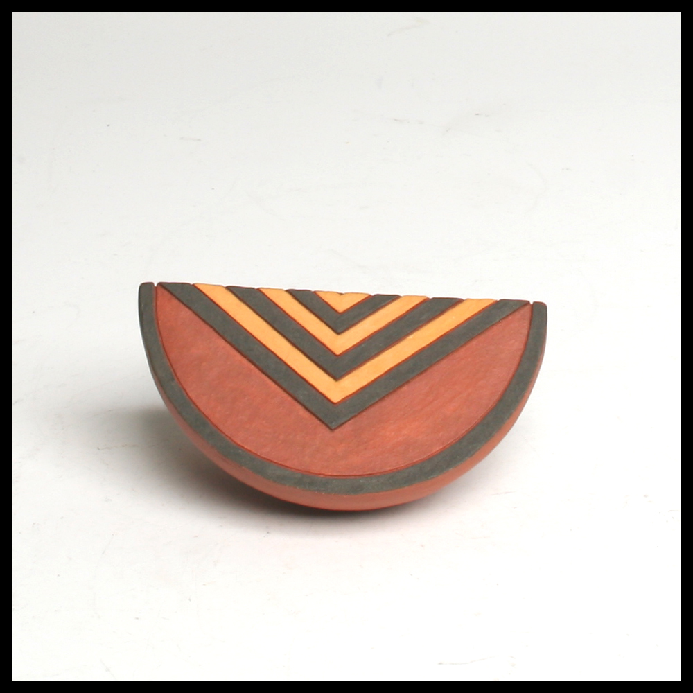 Ines Büsing (DE), een klein “bolvormig segment”, bestaande uit een rond gedeelte en vlakke kleiplaatjes, de twee zijden met geometrische decoratie, deels doorboord en ingesneden en gevuld met gepigmenteerde engobes, hoogte 4,9 cm, breedte 6 cm, 1991, aangekocht door de eerste eigenaren in Galerie Los Hoes in Ootmarsum.