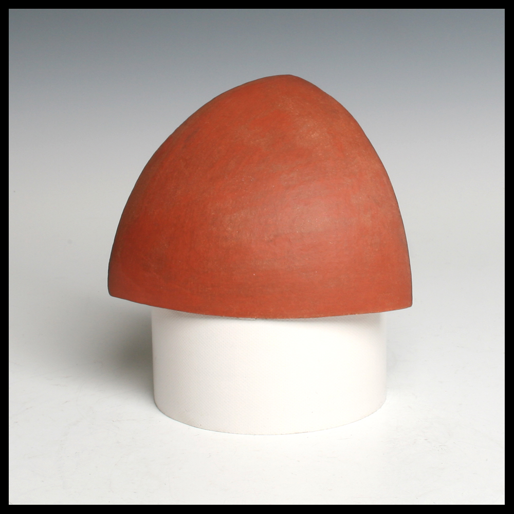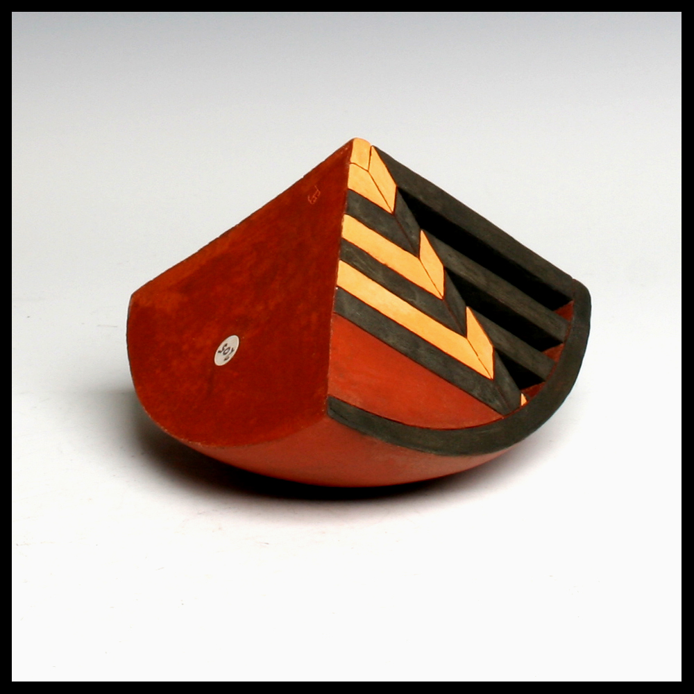 Ines Büsing (DE), een kleine ‘Pyramidal Kugelsegment’, uit een deel van een ronde vorm en platte plaatjes klei opgebouwd, twee van de drie zijdelen met een geometrische decor, deels opengewerkt en ingekrast en opgevuld met gepigmenteerde engobes, 1992. Door de eerste eigenaren aangekocht bij Keramiekgalerie Los Hoes te Ootmarsum (NL).