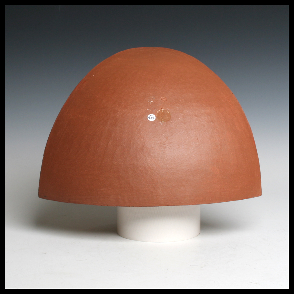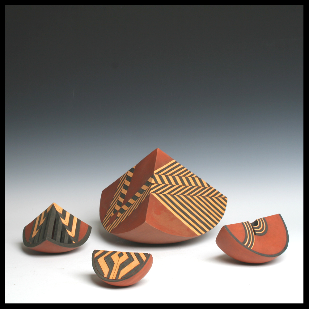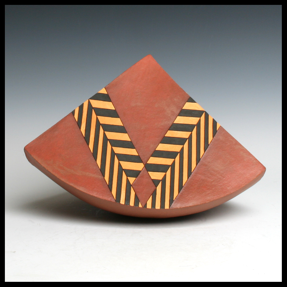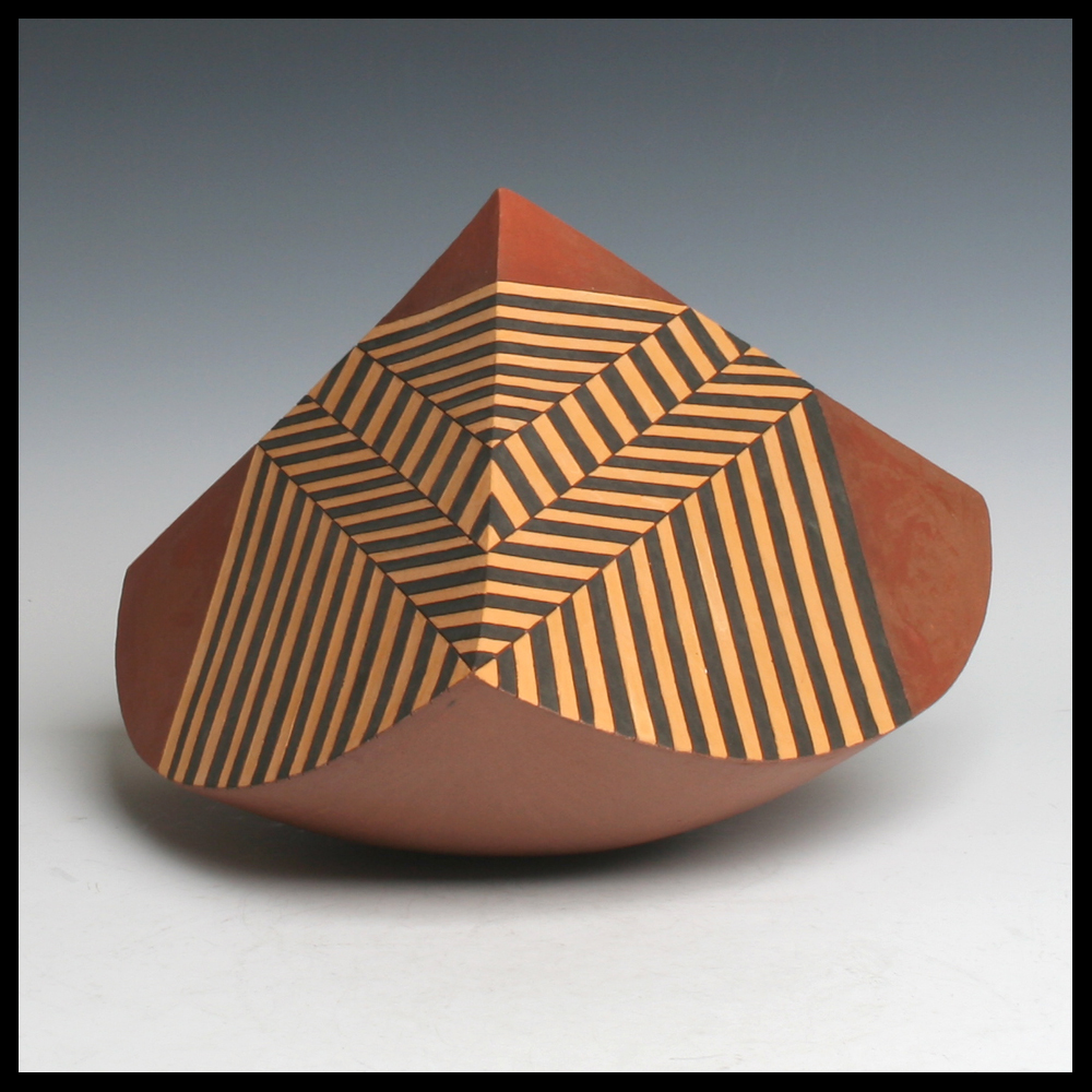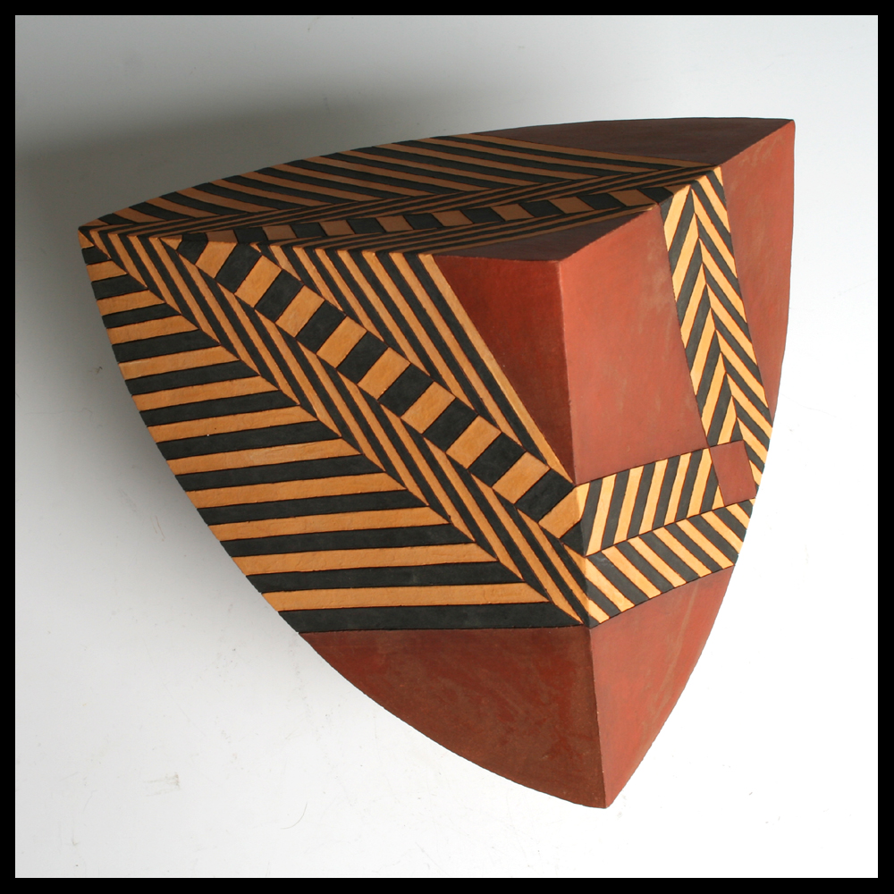 Ines Büsing (DE), middelgrote ‘Pyramidal Kugelsegent’, matte geometrische engobe decors, hoogte 19,5 cm, diameter 27,5 cm, 1992. Dit object is door de eerste eigenaren aangekocht bij Keramiekgalerie Los Hoes, Ootmarsum (NL).