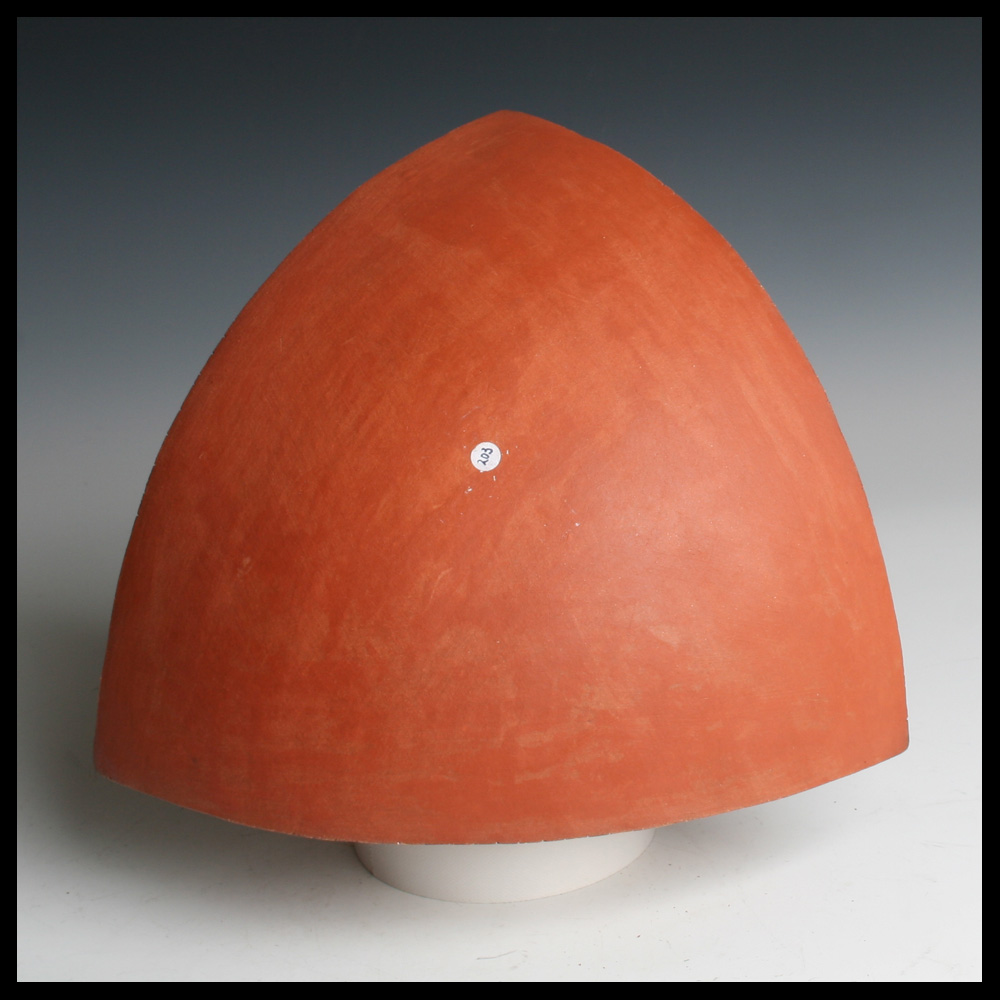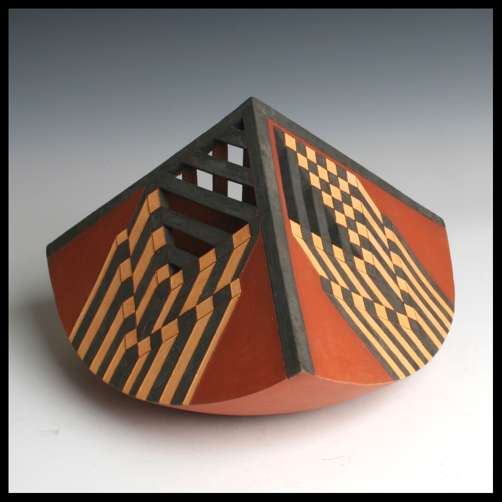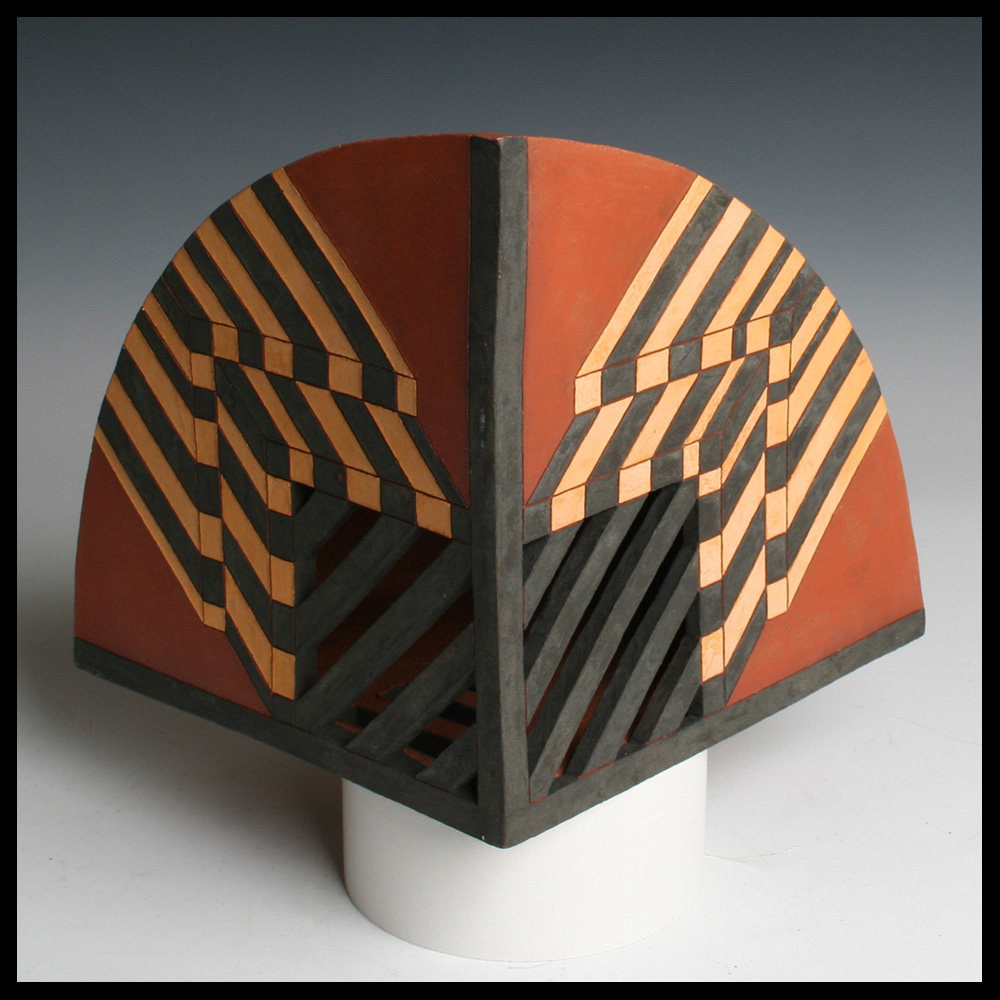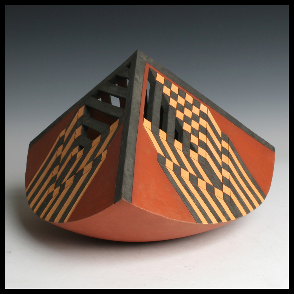Ines Büsing (DE), “Pyramidal Kugelsegment I”, een uit platen klei opgebouwde kwart bol met drie zijden, deze zijn aan de bovenzijde op verschillende wijzen opengewerkt, met ingekraste geometrische patronen die een dieptewerking suggereren, engobes in zwart, geel en roodbruin, hoogte 18 cm, diameter 26,5 cm, circa 1992. Door de eerste eigenaren aangekocht in Galerie Los Hoes te Ootmarsum (NL).
