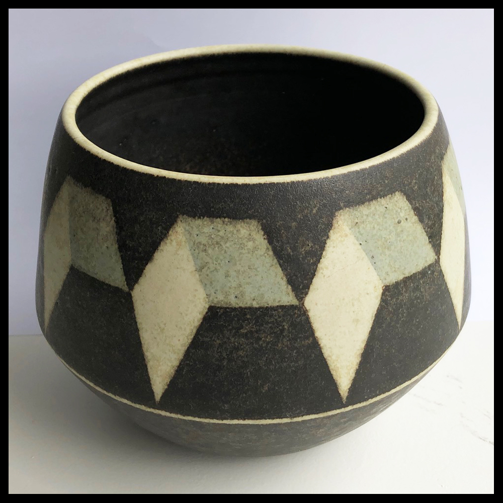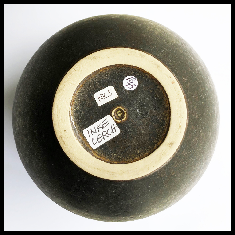 Inke Lerch (DE), kom, op de schijf gedraaid, steengoed, de wand keert halverwege op een horizontale witte rand naar binnen, geometrisch deels uitgespaard blokmotief, onderzijde en binnenzijde effen donkerbronskleurig, hoogte 11,3 cm, diameter 14,7 cm, 1990s.