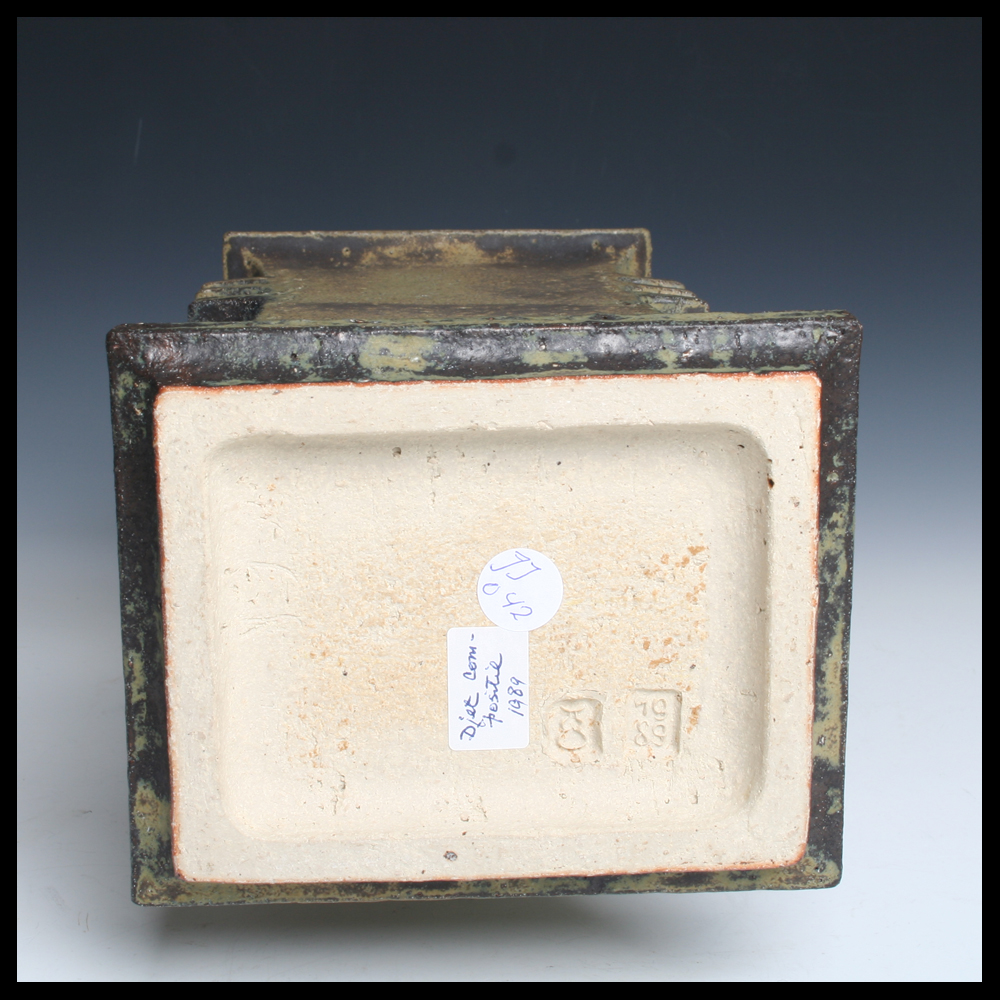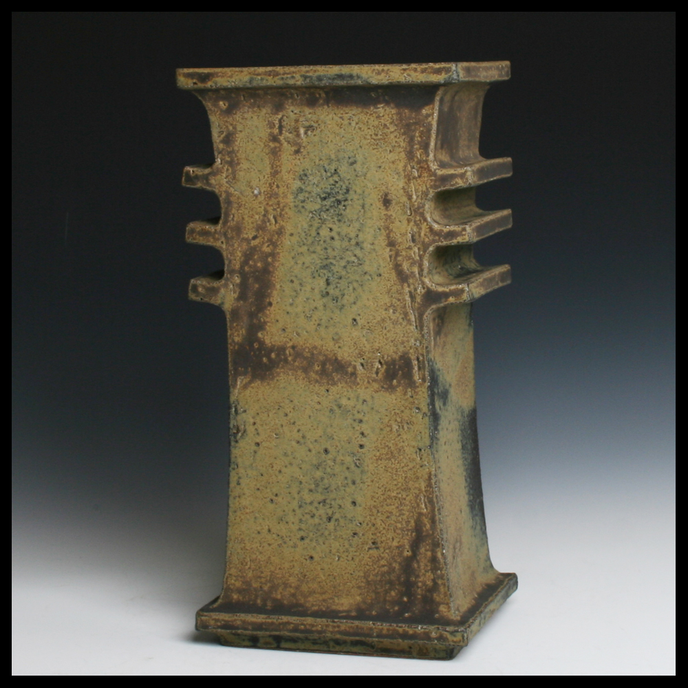 Jan de Rooden (NL), een uit platen klei opgebouwde zuil met een vierkante opening bovenzijde, getiteld ‘Djet’ compositie, eigen kleisamenstelling, met drie kragen links- en rechts, matte veldspaatglazuur met levendige schakeringen, hoogte 34 cm, 1989. De naam ‘Djet’ verwijst naar de vroeg Egyptische cultuur.