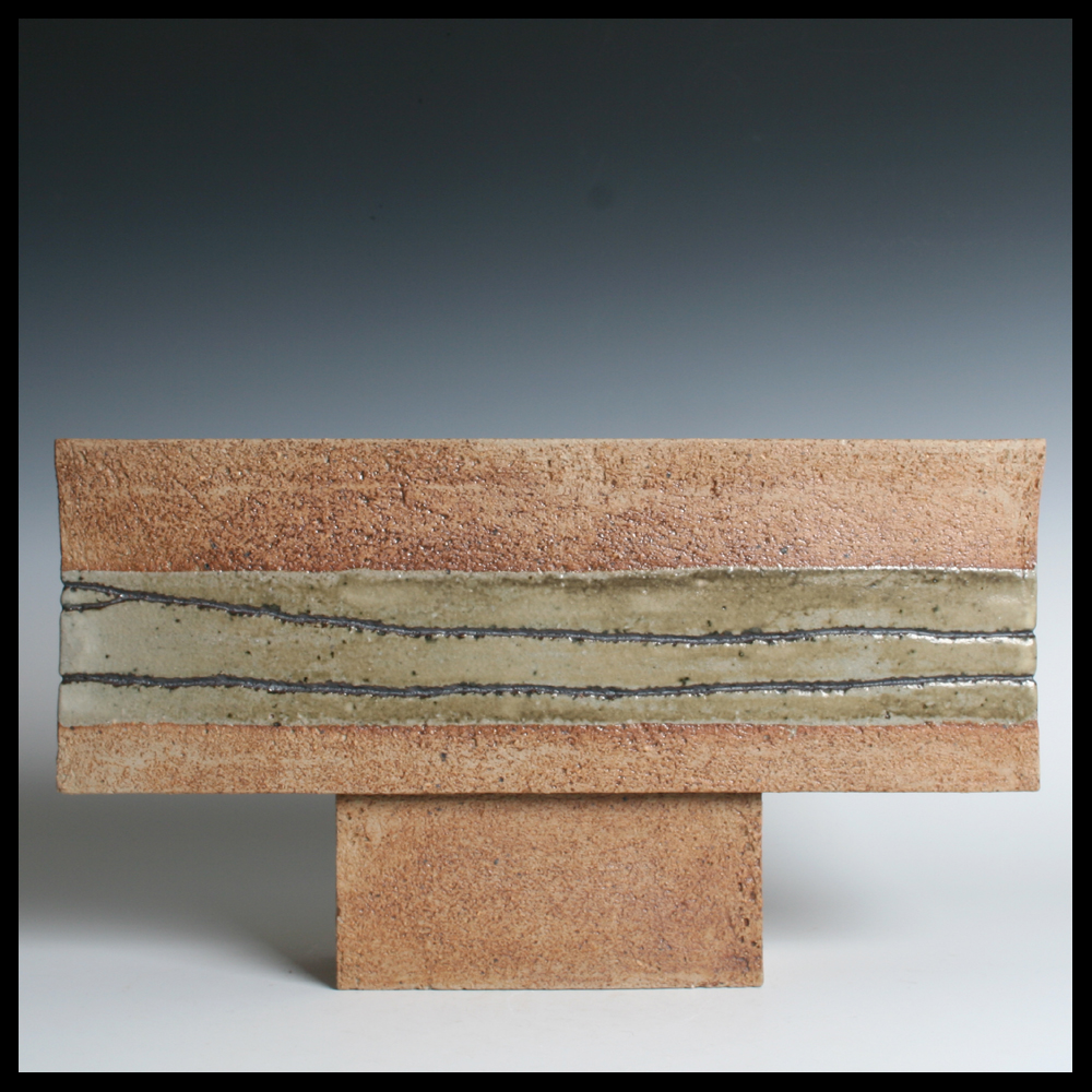 Jan de Rooden (NL) – groot rechthoekig blok op terug geplaatste voet, gevormd uit platen klei van eigen menging, steengoed, met een ingekraste horizontale baan, deze met veldspaat geglazuurd, hoogte 24 cm. Destijds is dit object door de eerste kopers aangeschaft bij Galerie Ina Broerse in Amsterdam.