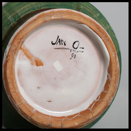 In 1993 heeft Jan Oosterman zich al jaren niet meer actief bezig gehouden met het draaien van keramiek. Allerlei vormen en ook platte kleiplaten werden gebruikt als drager om zijn fantasiewereld op te schilderen. Fietsen, stoelen, tenten en vooral ook dreigende zwarte kraaien spelen een belangrijke rol in de thematiek. Bij deze gedraaide of zelfs mogelijk uit kleirollen opgebouwde pot is de onderkant uitgevoerd in bruintonen met horizontale lijnen en één ingekraste lijn, waarschijnlijk ontstaan bij het afdraaien van de voet. De bovenzijde is beschilderd in groen met daaroverheen aangebracht een horizontale band in witte tinglazuur van telkens elkaar overlappende stroken klei. De overlaps zijn contrast gekleurd, daartussen zijn afbeeldingen van dreigende kraaien weergegeven. De binnenzijde is met een witte tinglazuur bedekt. De bovenrand van de pot heeft een matte engobe die aansluit op de bruine onderkant. Aan de onderzijde een geschilderde signatuur Jan O en 93.