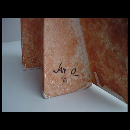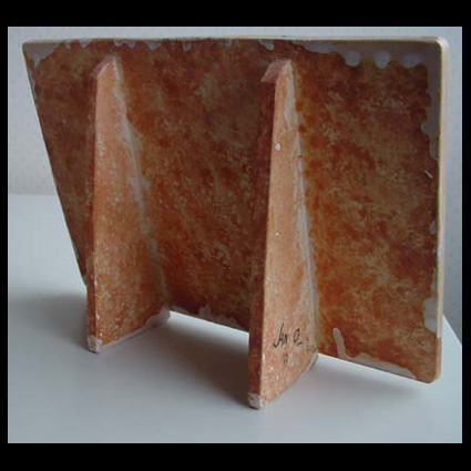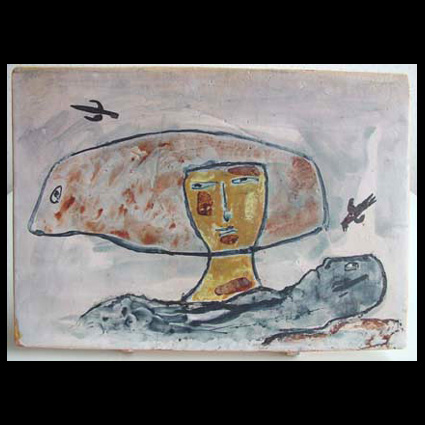 Jan Oosterman NL) gebruikt – sterk beïnvloedt door het werk van Picasso – zijn keramiek als drager om zijn artistieke gevoelens in uit te krassen of te beschilderen. Drie jaar vóór zijn dood maakt hij deze krachtige keramische plaat met steunen van roze bakkende klei. Jan Oosterman is bang voor de dood en schildert zichzelf hier als de stervende met naast zich zijn vrouw. Zijn hond Poen zweeft hier zonder poten al de hemel in, in de lucht dreigende raven. De decoratie is deels met matte engobes, met uitzondering van het gezicht van de vrouw, deze is in glanzende glazuur.