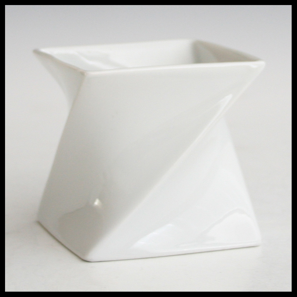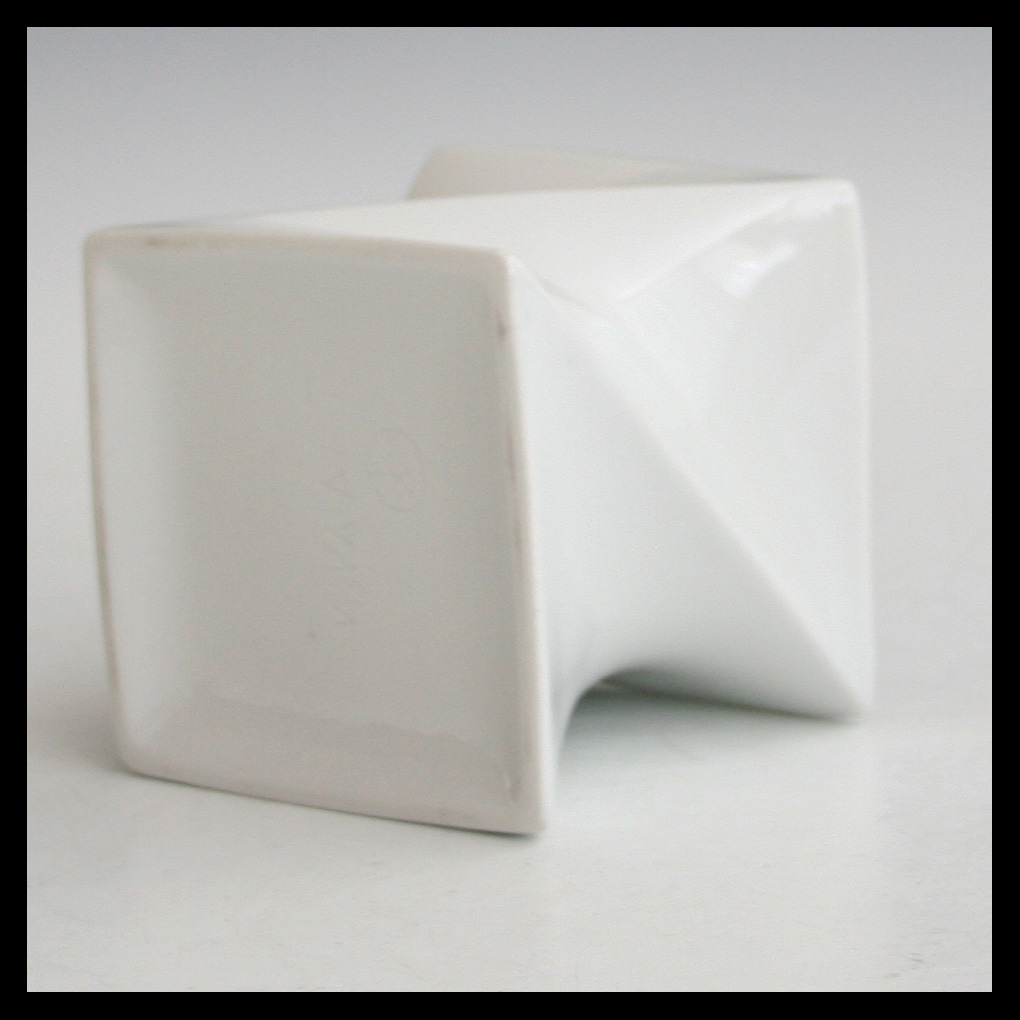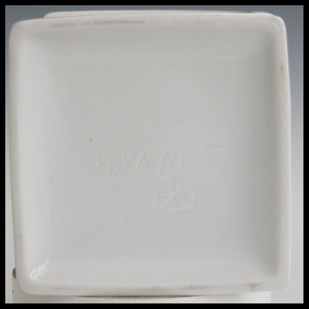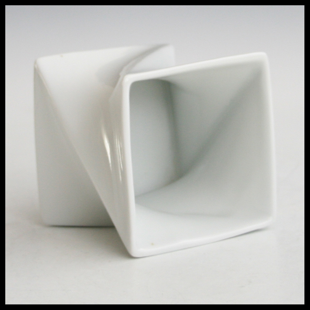 Jan van der Vaart (NL), diagonaal gedraaide vierkante vaasvorm, porselein, in een mal gegoten in eigen atelier, transparant geglazuurd, hoogte 8,5 cm, 1985.