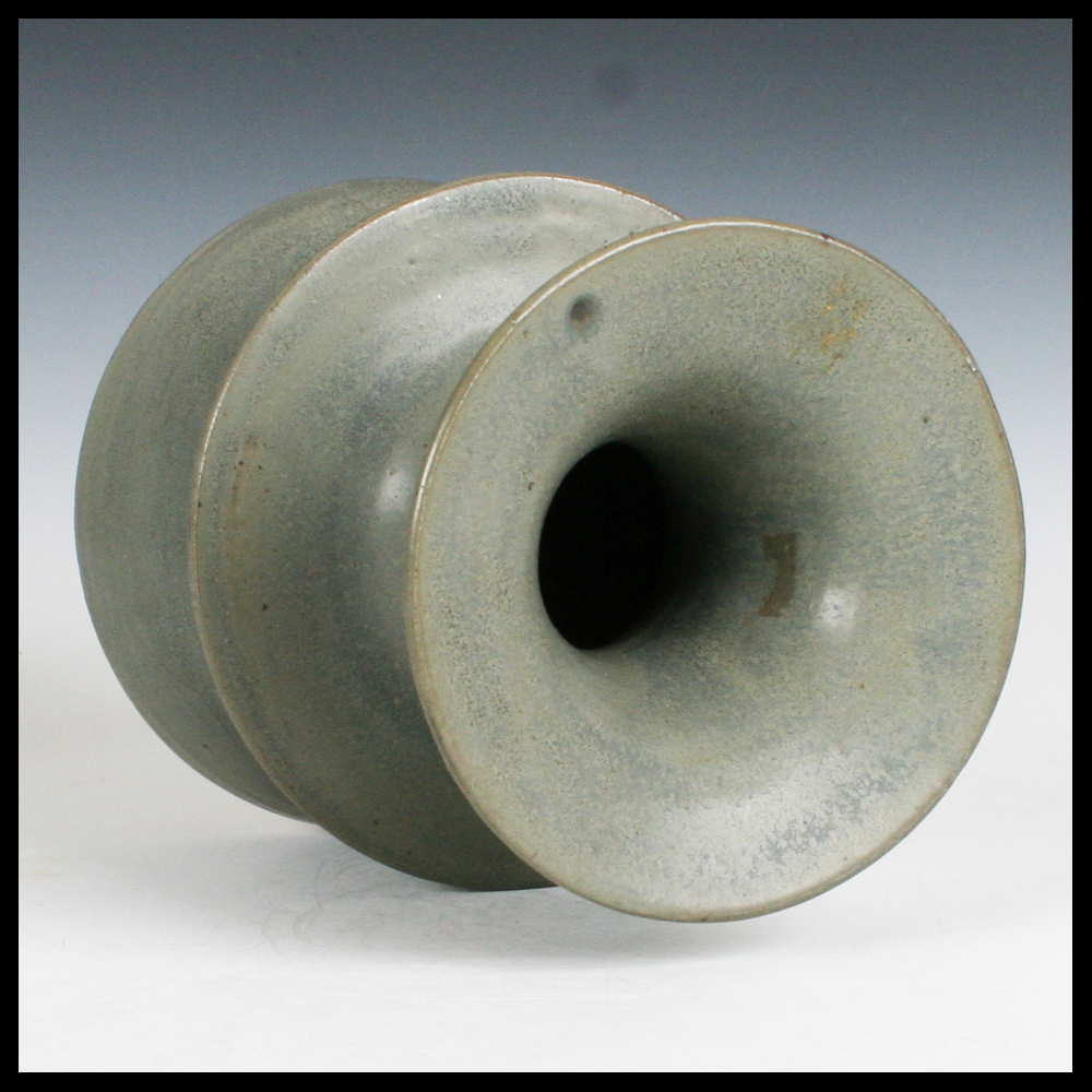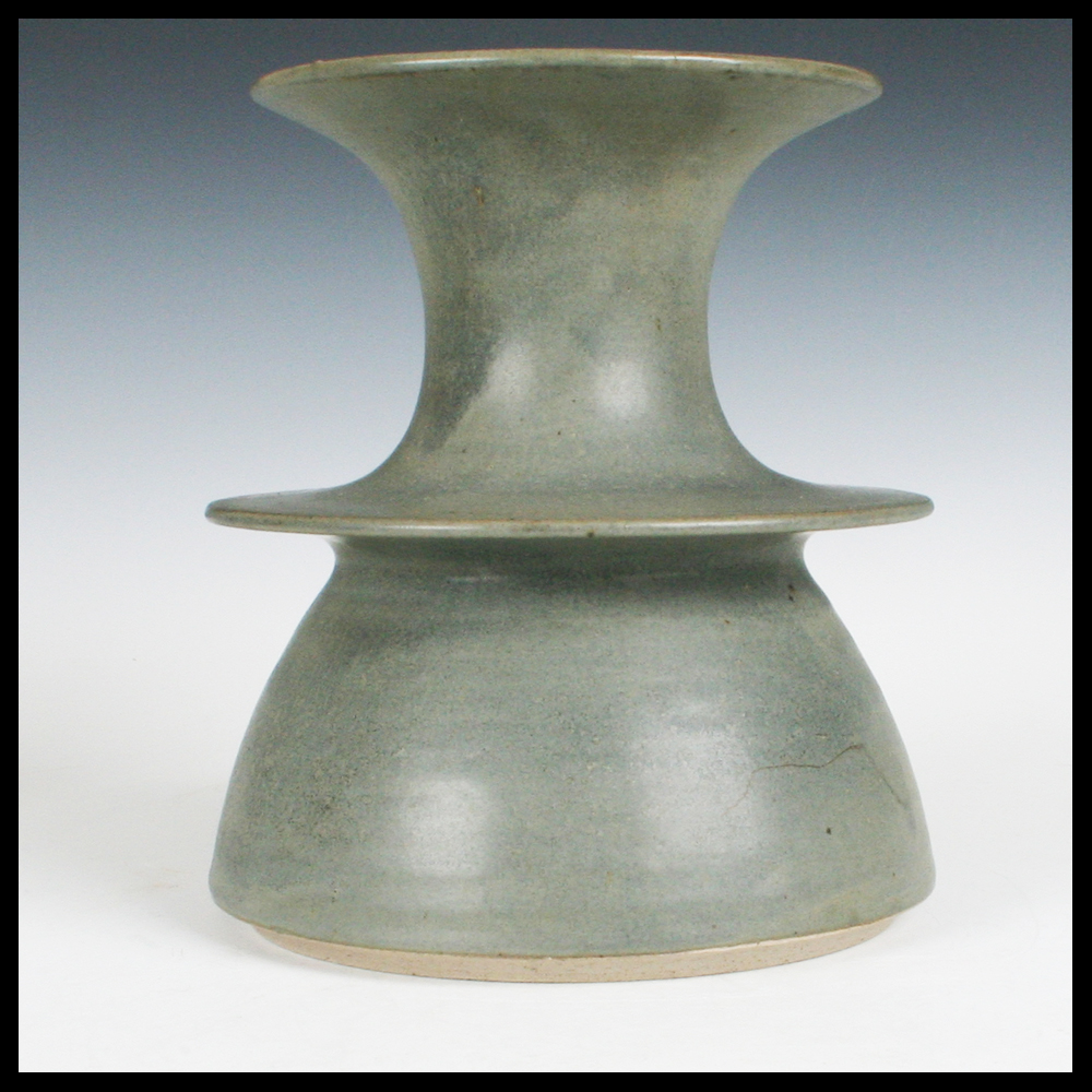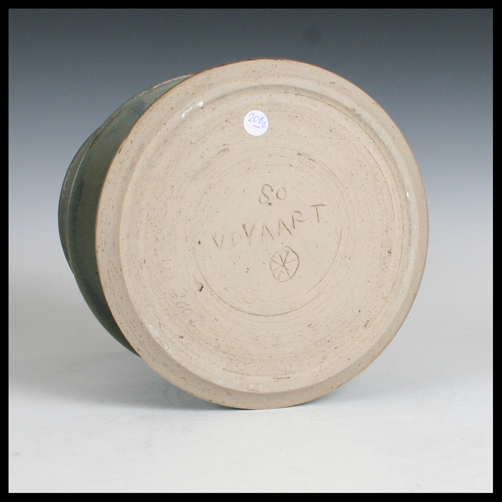 Jan van der Vaart (NL), middelgrote vaas, op de schijf gedraaid, met uitlopende hals en grote kraag, afgedraaide voetrand, steengoed, grijs-groene semi matte glazuur, ingekraste signatuur met rad, hoogte.20 cm, diameter 18,5 cm, 1980.