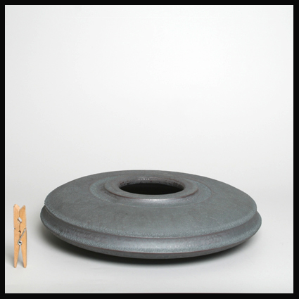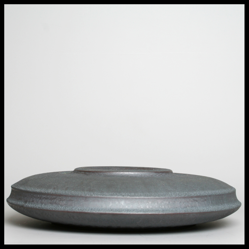 Johan Broekema, een zeer grote discusvormige platte vaas, loodkleurige ijzeroxideglazuur (zoals Broekema dat leerde van de Duitse keramist Horst Göbbels), ca. 1990. Het maken van een dergelijke vaas vraagt van de kunstenaar de moeilijkste graad van pottenbakkerskunst.