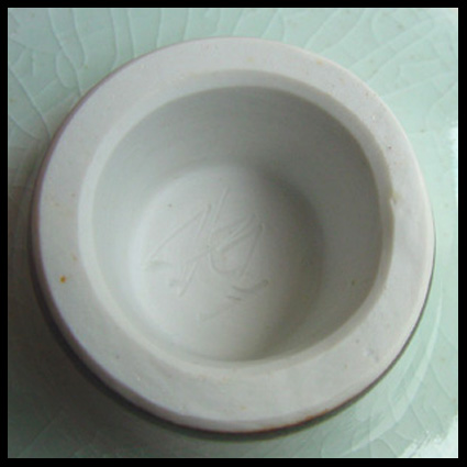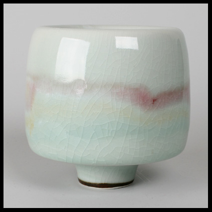 De altijd ijverige Johan Broekema werkte graag met het moeilijke porselein biscuit. Zwart, wit, sang de boeuff glazuren en ook celadon groen horen bij zijn favoriete glazurenpallet. De hier aangeboden komvaas met naar binnen geslagen rand heeft een prachtige transparante craquelé celadon glazuur met een zweem van vage horizontale contastkleuren in zacht rood, geel en groen. The ever industrious Johan Broekema loves to work with the difficult porcelain biscuit. Black, white, sang de boeuff glazes and also celadon green belong to his favourite palette of glazes. The bowl-vase we offer here, featuring inwarded folding rim, has a beautiful transparent crackled celadon glaze, with a touch of vague horizontal contrasting colours in soft red, yellow and green.