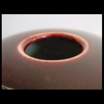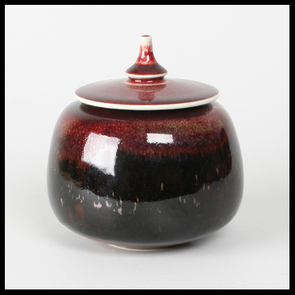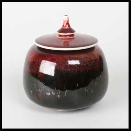 Een prachtige, typische Johan Broekema vorm. De porseleinen pot heeft een sterk naar binnen vallende hals met kleine mond. De brede deksel met apart knopje zweeft voor een deel boven de pot. De glazuur loopt van een temoku bruin naar een sang de boeuff rood. Aan de binnenzijde hals een kleine beschadiging, die eigenlijk zelfs zonder de deksel niet te zien is. A beautiful, typically Johan Broekma form. The porcelain pot has a strong inverted falling neck with a small mouth. The broad lid with unusual knob would seem to float above the pot. The glaze runs from a temoku brown to a sang de boeuff red. There is a little damage to the inside of the neck, that can hardly be seen, even without the lid.