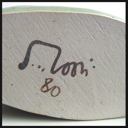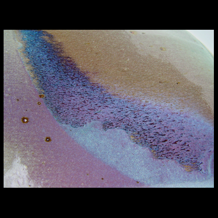 Johan van Loon heeft deze op een schoenvorm lijkende container opgebouwd uit twee grote platen dun steengoed die hij om een vruchtvormige bodemplaat heeft gemonteerd. De beide zijkanten heeft hij aan voor- en achterzijde tegen elkaar gedrukt terwijl aan de bovenzijde de platen van de voorzijde naar binnen zijn gevouwen. Het geheel heeft een prachtige hoogglans glazuur met op een fond van bronsgroen tot heidepaars een boog in onder meer blauw geschifte effecten. Johan van Loon has built up this shoe-shaped container made from two large plates of thin stoneware, which he has mounted on a fruit-shaped base plate. He took the two sides and pressesd the front and reverse sides together, whereas the top side of the front plates have been folded inward. The entire object has a beautiful high-gloss glaze on a background of bronze-green to heather-purple and there is an arch painted blue amongst other colours, with curdled effects.