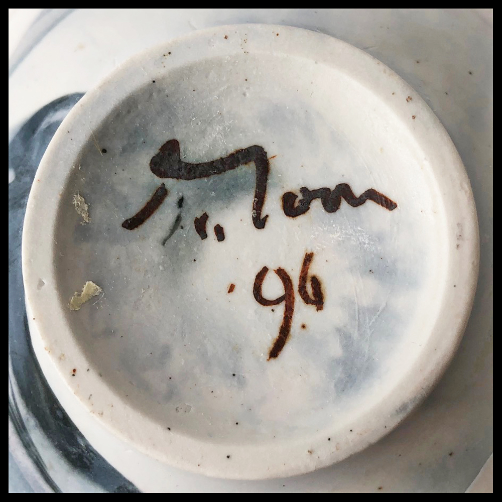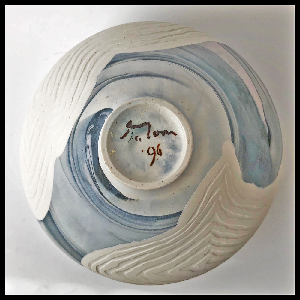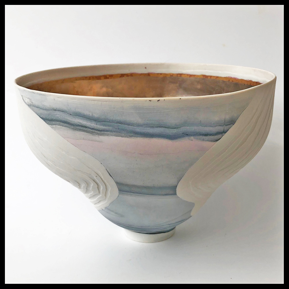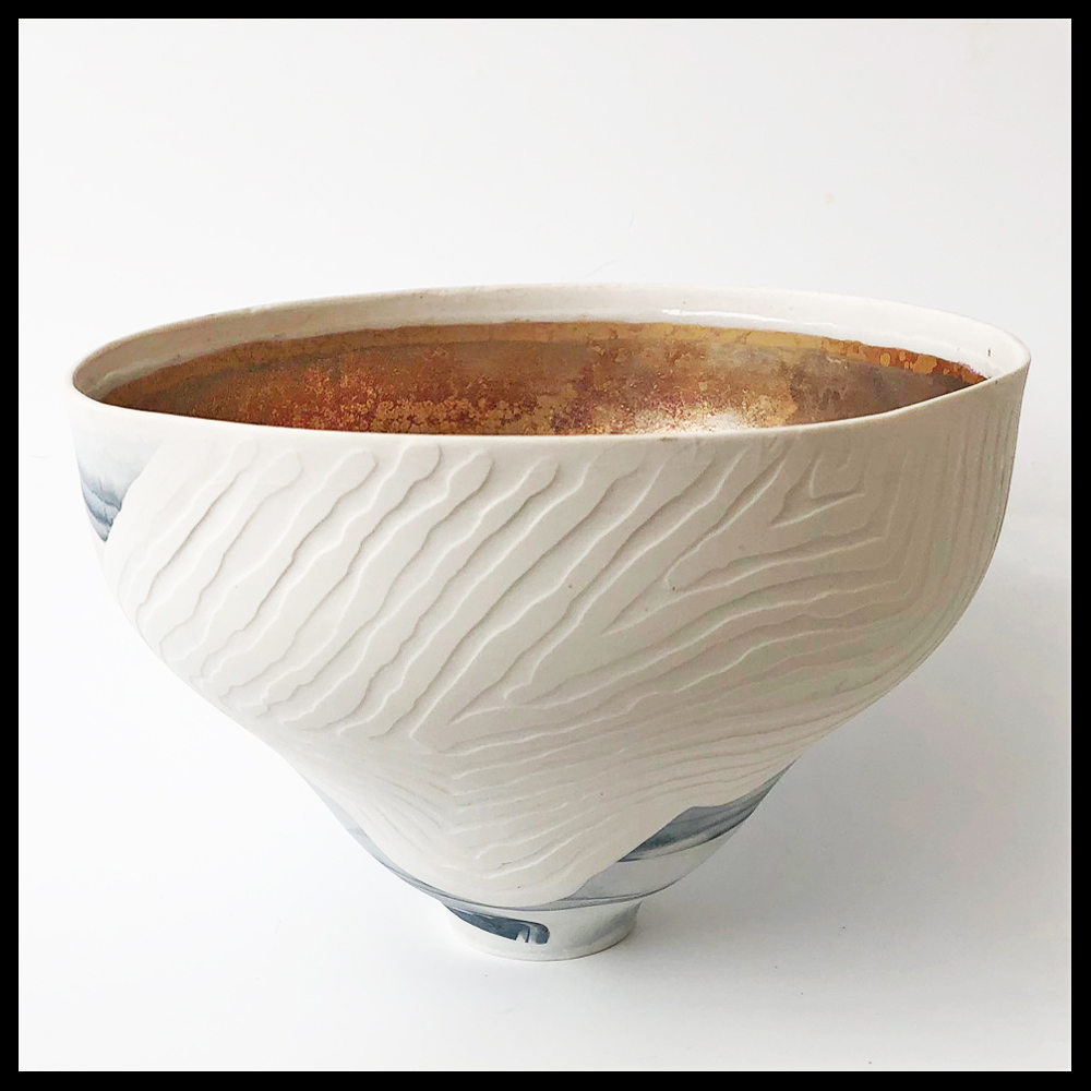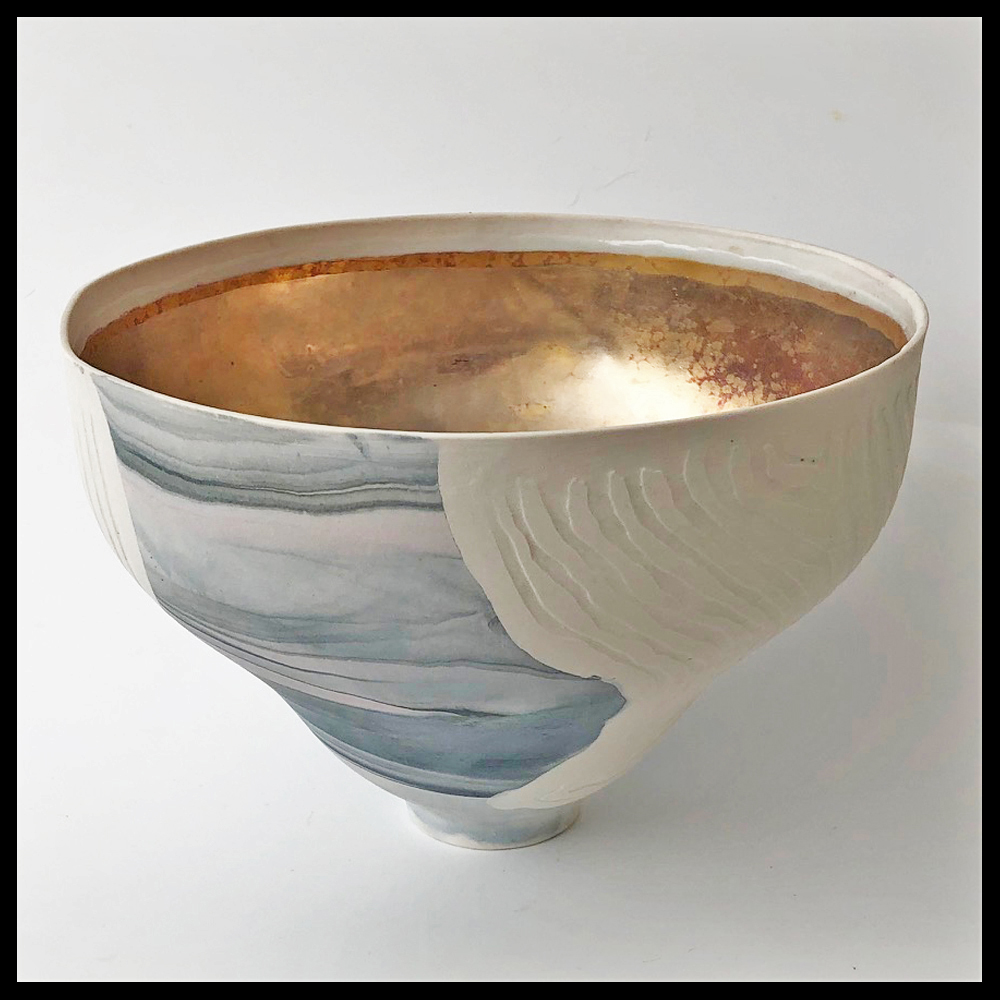 Johan van Loon (NL), conische komvorm, op de schijf gedraaid, porselein, buitenzijde met een gewolkt blauw decor, voor twee derde overdekt met een verdikte porseleinlaag met gegutste waaiervormige reliëflijnen, interieur is goudkleurig, hoogte 13,5 cm, diameter 19,6 cm, geschreven monogram en ’96, 1996.