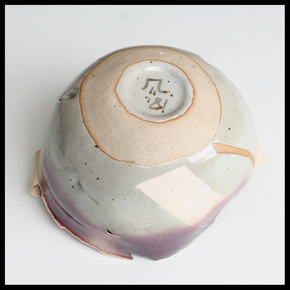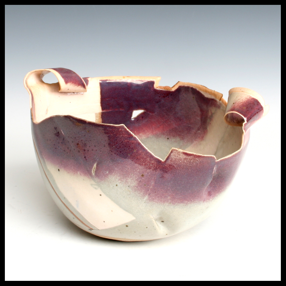 Johan van Loon (NL), dunwandige kom uit repen klei opgebouwd, gehakkelde rand en twee kruloren, diagonaal ogende decoratie, voor de glazuurbehandeling in grijs, rood en offwhite is met air brush gewerkt, zijn delen afgeplakt geweest en is wax resist toegepast, hoogte 14,5 cm, diameter 23,5 cm, gesigneerd en gedateerd ’81.