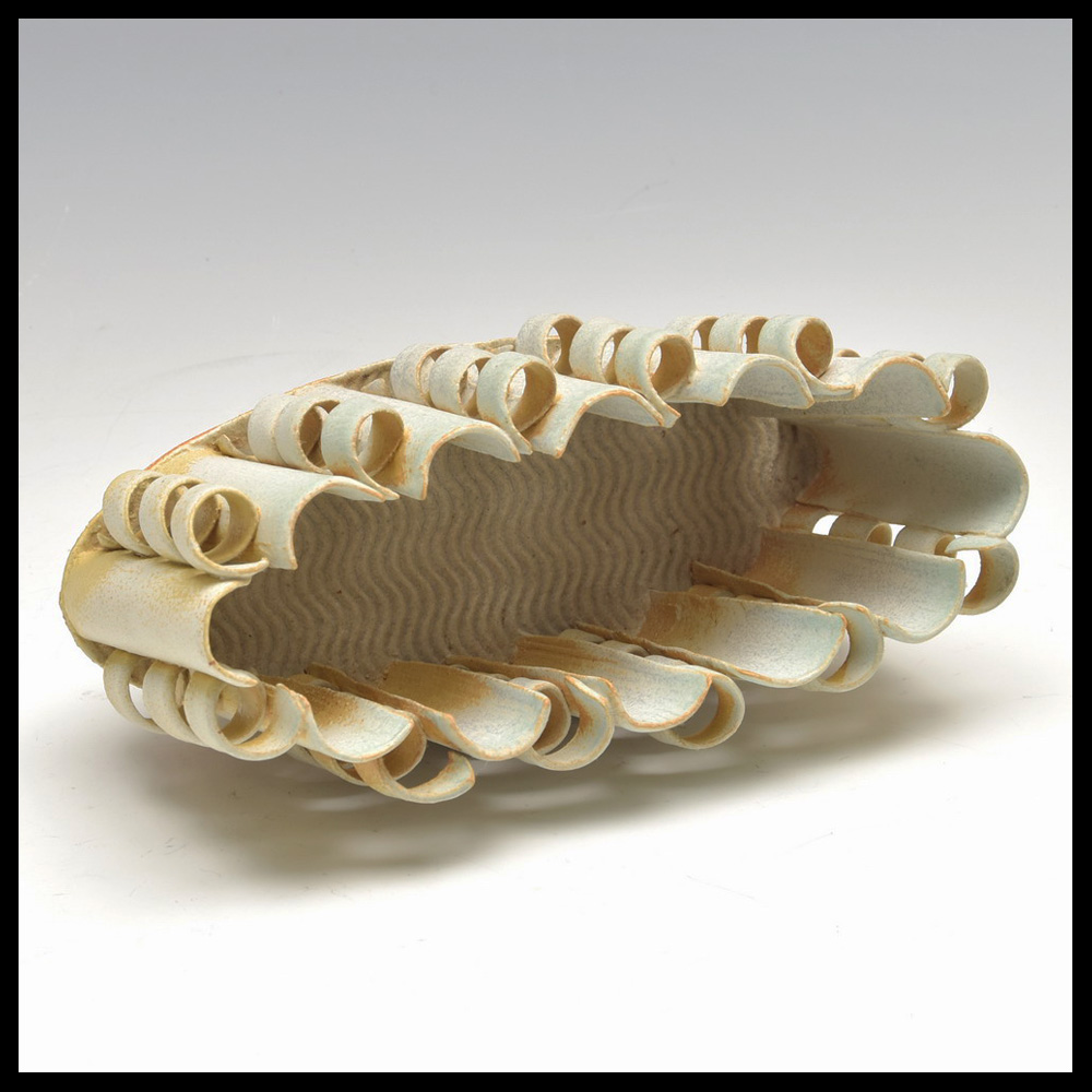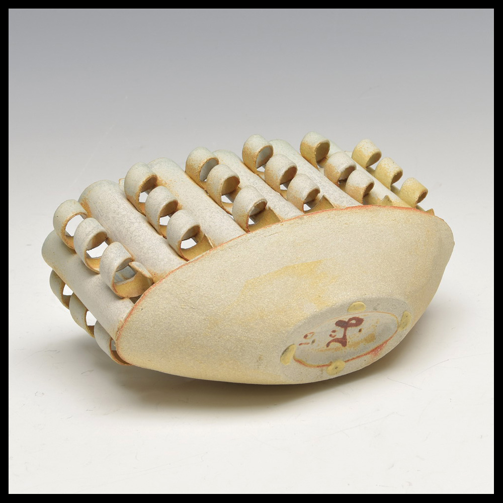 Johan van Loon (NL), krullenkom, de voet op de schijf gedraaid en ovaal vervormd, de bovenzijde voet met een ribbeldecor, als doorzichtige wand zijn alternerend halve kokertjes met krullen gemonteerd, steengoed, de voet is niet geglazuurd, de bovenzijde mat lichtgrijs geglazuurd, hoogte 13,6 cm, breedte 20,5 cm, diepte 9,6 cm, geschilderde signatiuur en 01, 2001.