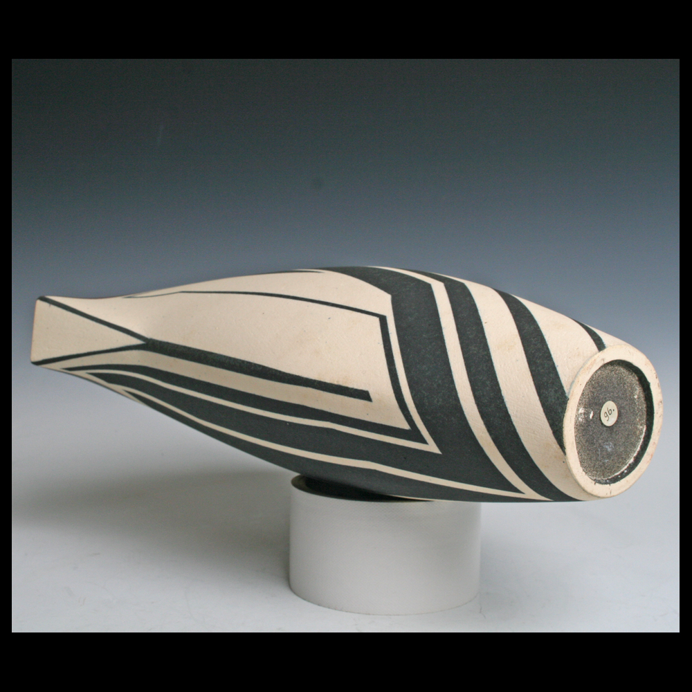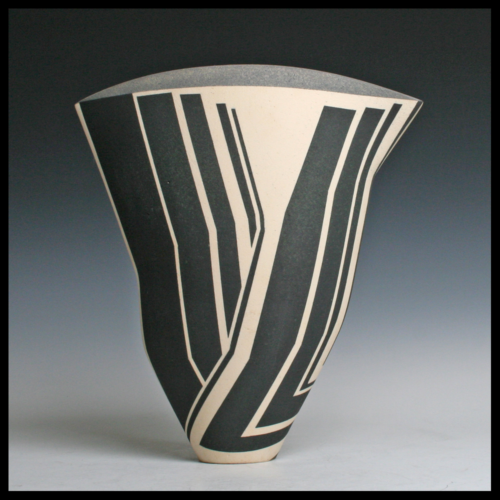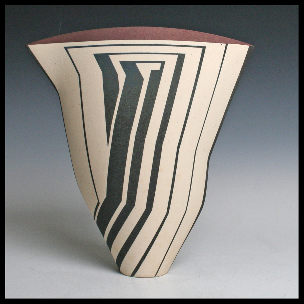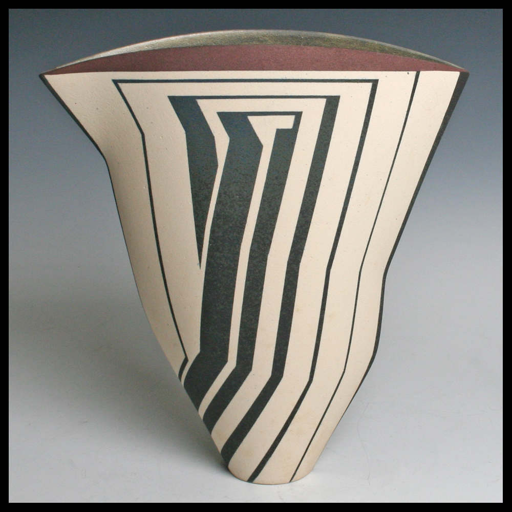 Jon Middlemiss (UK), een uit platen klei opgebouwde container uit de Echo Series met een sprekend geometrisch decor, verschillend aan de voor- en achterzijde, aan de bovenrand een deels grijze- en een deels aubergine baan, zonder titel, hoogte 27,4 cm, breedte bovenzijde 25 cm, ca. 1990. Door de eerste eigenaren aangekocht bij Galerie Anderwereld in Groningen. Collectie Hans & Inge Fuchs.
