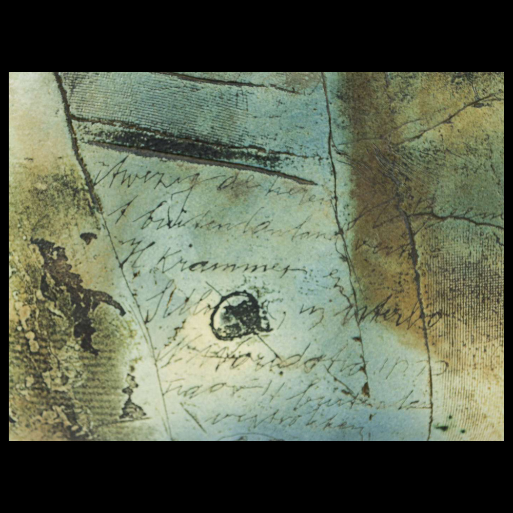 Kees (Ben) van Renssen (NL), keramisch tablet, tekst uit de notulen NL- ISR Gem. Pekela, 1942, afmetingen 11,5 x 42 x 44 cm,1990. Opmerking: de tekst op het tablet komt uit het Memorboek, platenatlas van het leven der Joden in Nederland van de middeleeuwen tot 1940 door Mozes Heiman Gans, Bosch & Keuning n.v., Baarn 1971. Daaruit de bladzijde 827. Het zijn de laatste notulen van de Nederlands-Israëlische Gemeente Pekela van Abraham Toncman. Dit object is verkocht aan het Joods Historisch Museum te Amsterdam.
