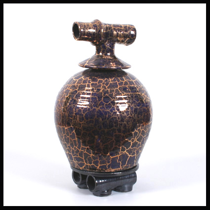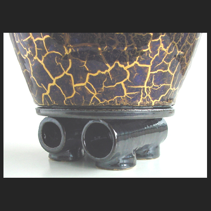 Laurens Goldewijk heeft in 2008 zijn draaischijf aan de wilgen gehangen. Op zijn afscheidsexpositie aan het einde van 2008 was de hier aangeboden drie-delige gelegenheidsvaas één van de topstukken. Goldewijk heeft hier nog het inmiddels om milieu redenen verboden Congolese kobalt toegepast. Deze kobalt glazuur heeft hij destijds geërfd van de Eper pottenbakker Frans Slot. In deze pot is naast het kobalt het dure goudoxide toegepast. Dit geeft een bijzonder uniek effect aan dit object. Een effect zoals wij dat alleen nog tegenkomen bij het werk van de kunstpottenbakker Laurens Goldewijk uit Zevenaar. De dekselpot staat op een keramische zwarte Japans aandoende voet. De deksel heeft een greep in de vorm van bamboe. Hierin kan een geluksbrief worden gestoken.