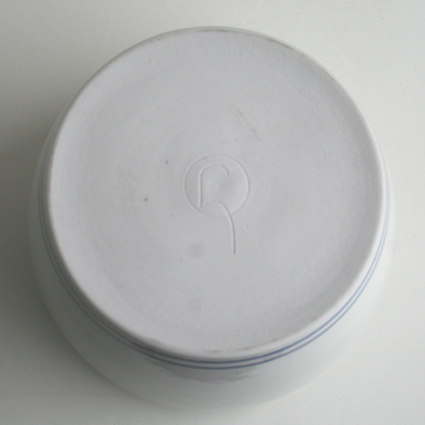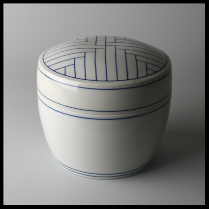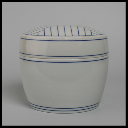 Leen Quist levert niet alleen als draaier een perfect product af. Ook de aangebrachte lijnen verraden een perfectionist. In deze dekselpot is een lineair vlechtwerk ingekrast en opgevuld met een blauwe vulling.
